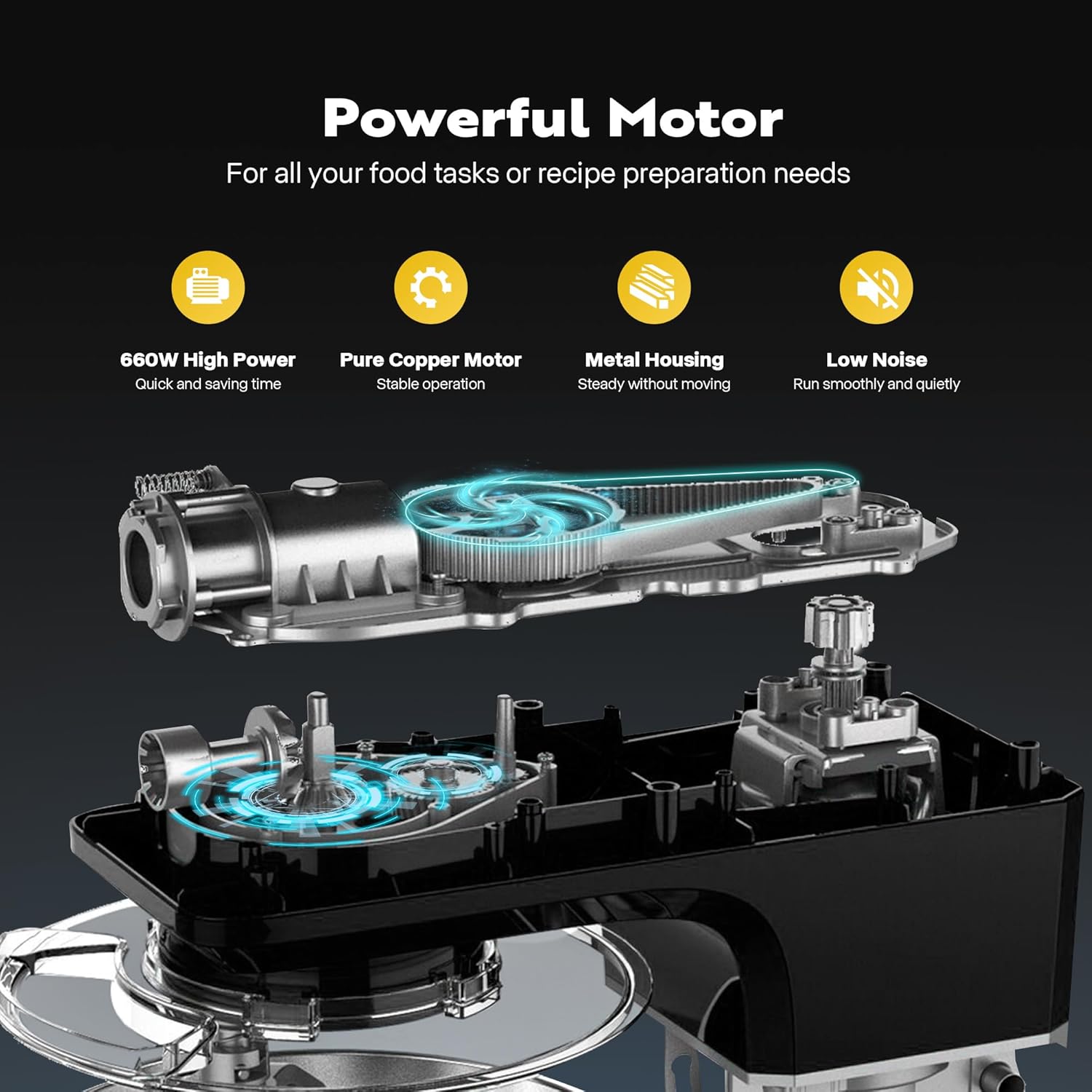 - POWERFUL MOTOR - With a high-performance 660W motor, the stand mixer finishes kneading and mixing more quickly and thoroughly than human hands. Handy 6-speed control with a pulse function is designed for all your food tasks or recipe preparation needs