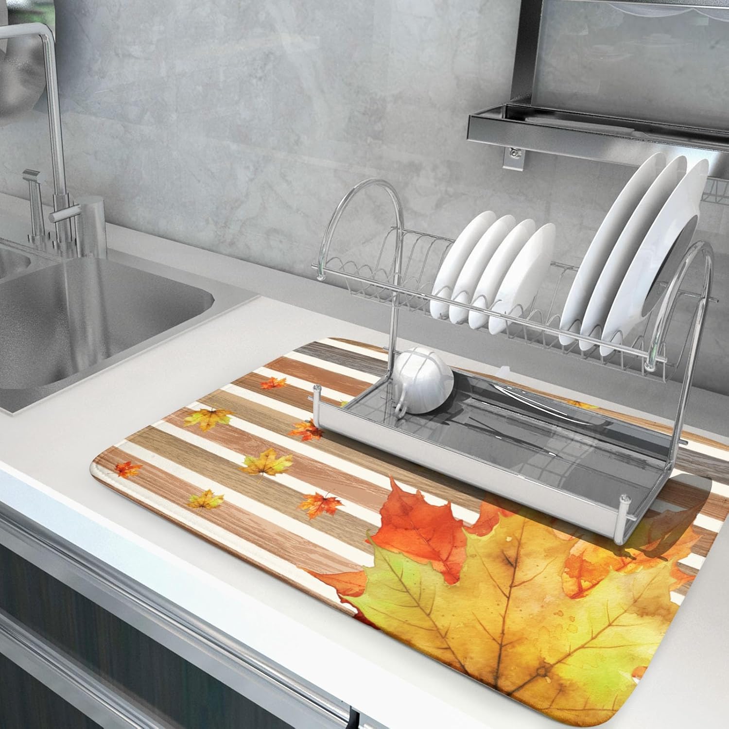 - 3【Widely Used】: The fall leaves drying mat for kitchen counter, coffee bar, dish drain rack, great for air drying dishes, glasses, silverware, pots, pans, fruits and vegetables. It's fade resistant and never stain your kitchen counter topand keep your counter dry.