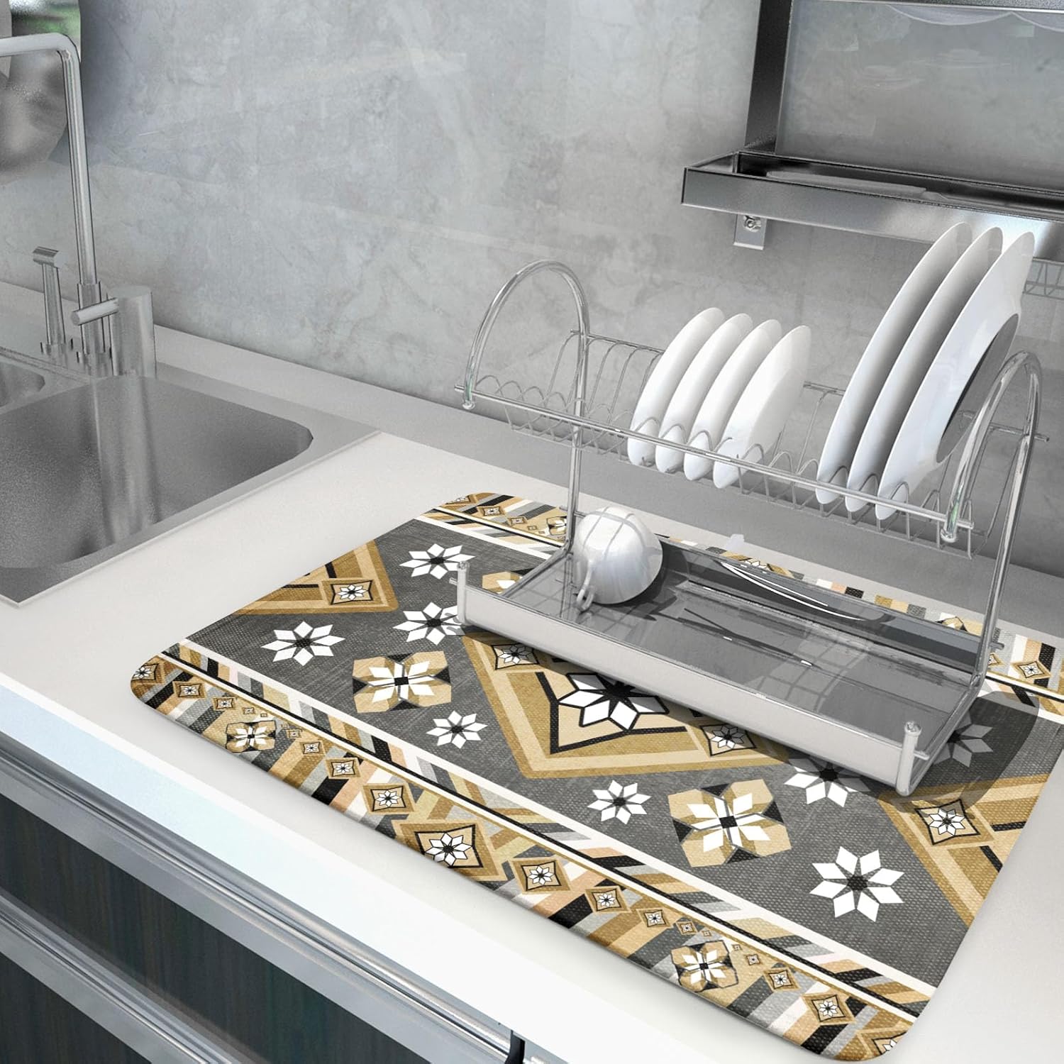 - 2【Widely Used】: The yellow gray boho flower dish drying mats for kitchen counter countertop, coffee bar, dish drain rack, great for air drying dishes, glasses, silverware, pots, pans, fruits and vegetables. It's fade resistant and never stain your kitchen counter topand keep your counter dry.