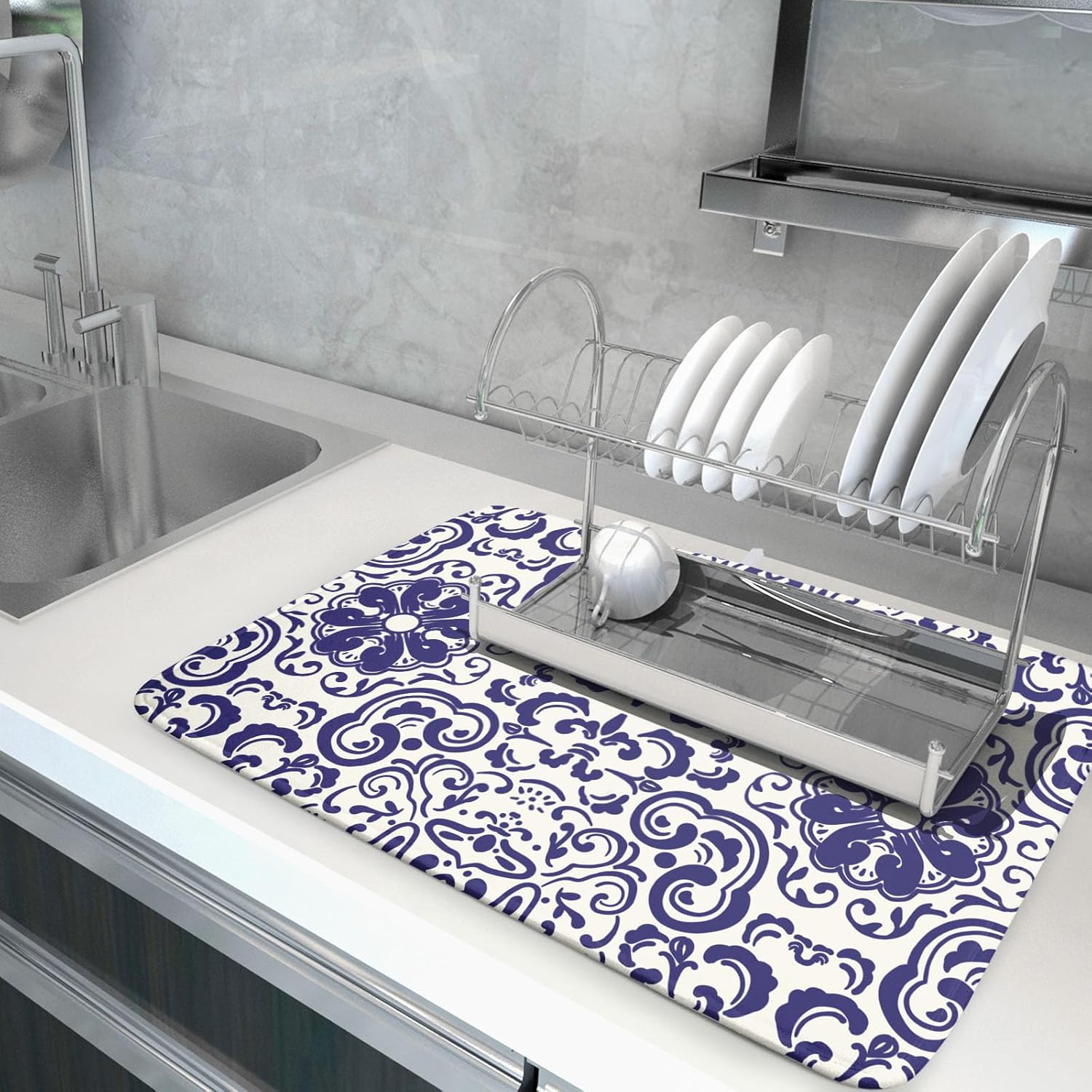 - 2【Widely Used】: The blue boho floral dish drying mats for kitchen counter countertop, coffee bar, dish drain rack, great for air drying dishes, glasses, silverware, pots, pans, fruits and vegetables. It's fade resistant and never stain your kitchen counter topand keep your counter dry.