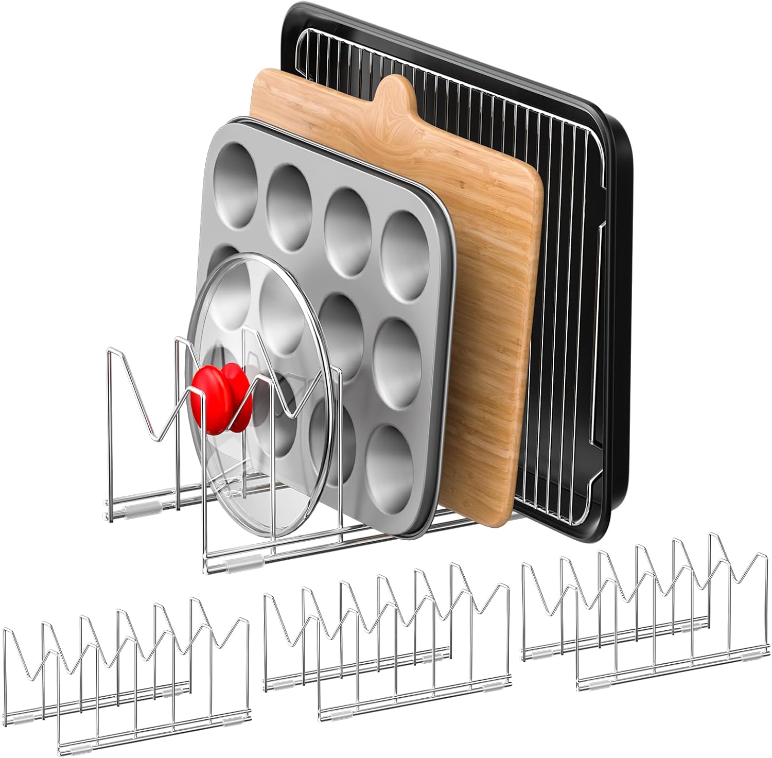 3 Pack Pot Lid Organizer for Cabinet, Stainless Steel Pot Lid Holder with Anti-slip Silicone Mat, Lid Rack for Pans Pots, Bakeware, Plates, Cookie Sheets, Trays, Cutting Boards, Silver