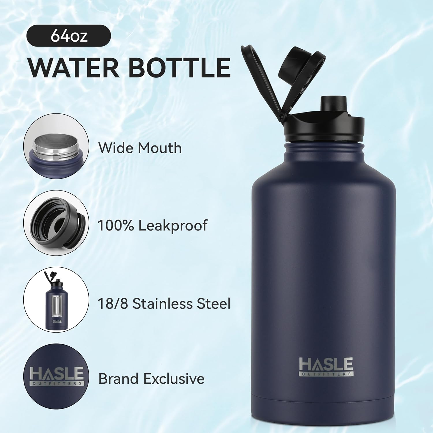 HASLE OUTFITTERS Half Gallon Insulated Water Bottles 64 oz, Stainless Steel Metal Water Jug with 2 Lids Keep Cold 48h/Hot 24h, Leak Proof & BPA-Free Water Flask Jug(Navy,1)