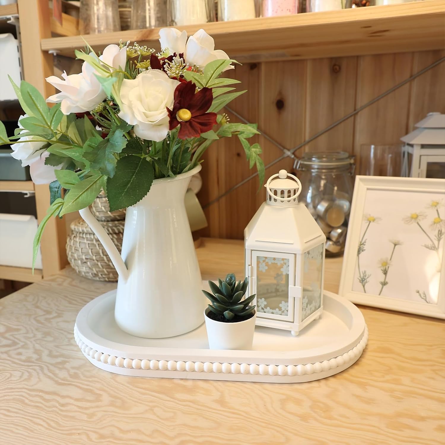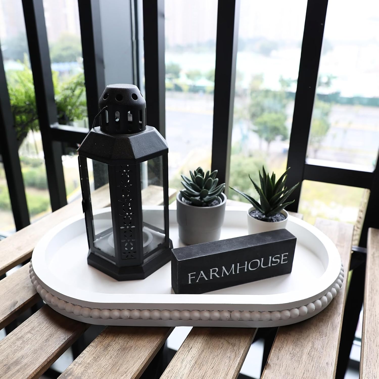 Oval Wood Serving Tray with Wooden Beads, Outdoor Farmhouse Decorative Tray for Ottoman, Coffee Table, Kitchen Counter Organizer, Home Decor(White)