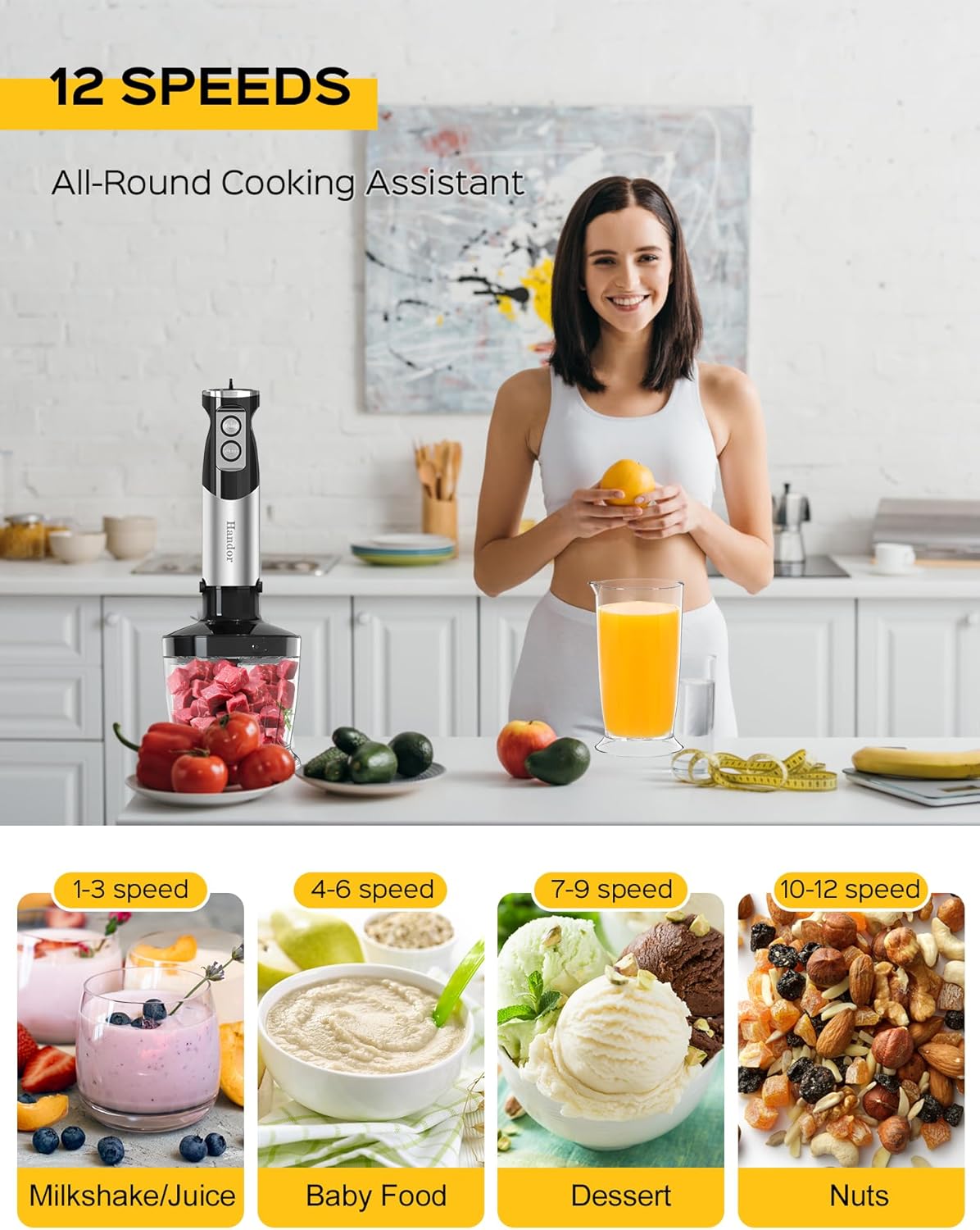 Handor 6-in-1 Hand Immersion Blender, 1000W 12 Speed Handheld Blender with 600ml Beaker, 500ml Chopper, Egg Whisk, Milk Frother, Stainless Steel Blades for Soup, Smoothie, Puree