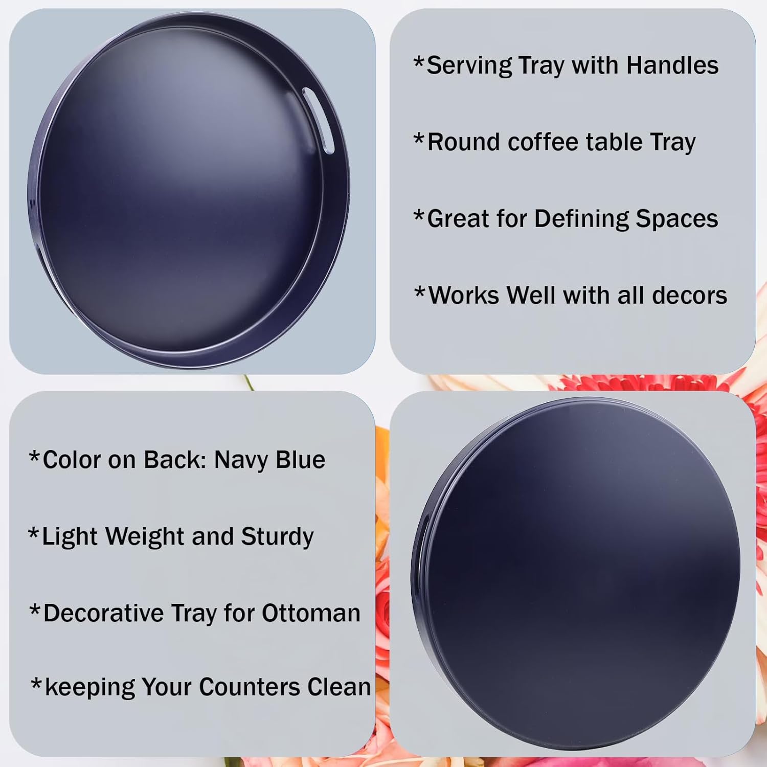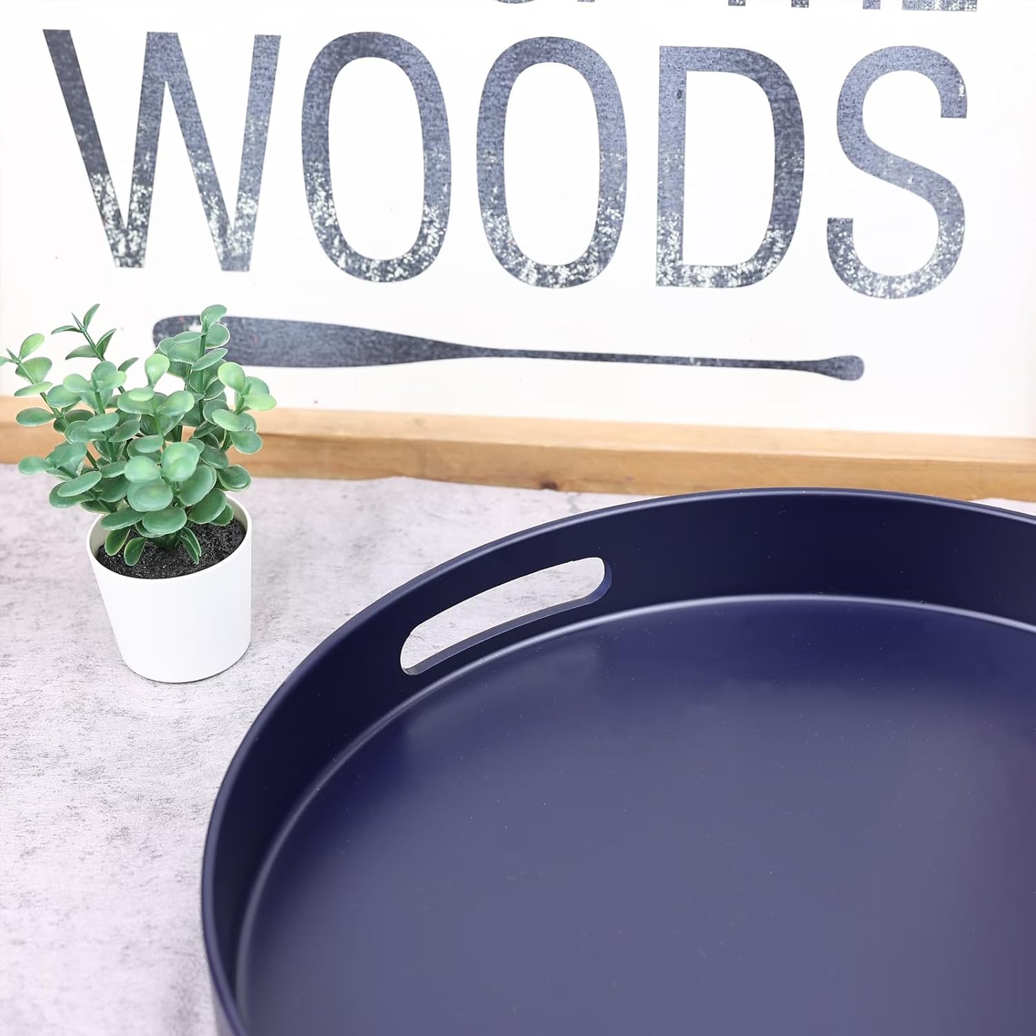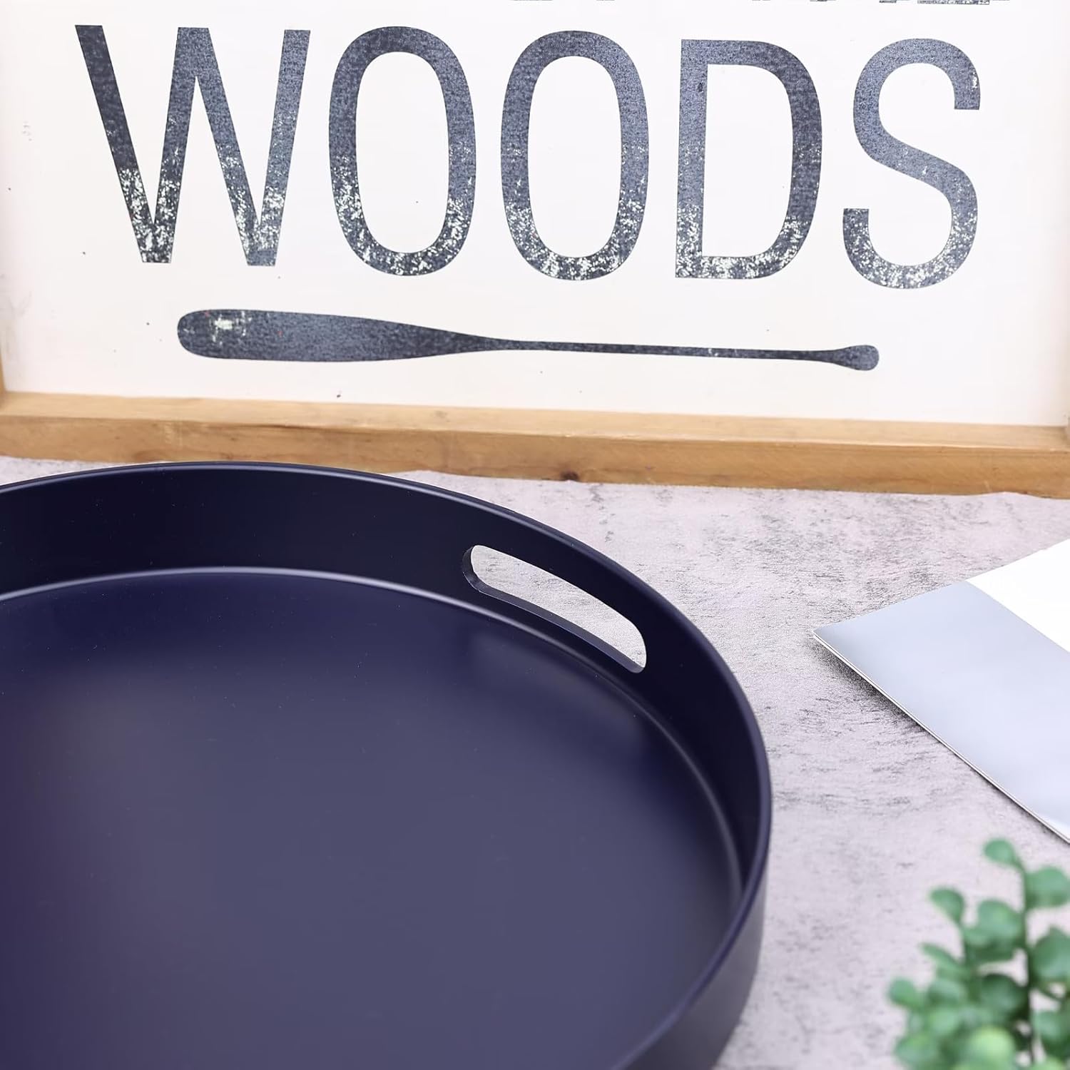 Navy Blue Decorative Serving Tray with Handles, 13” Versatile Ottoman Tray for Coffee Table, Entertaining, Outdoor Patio, Living Room