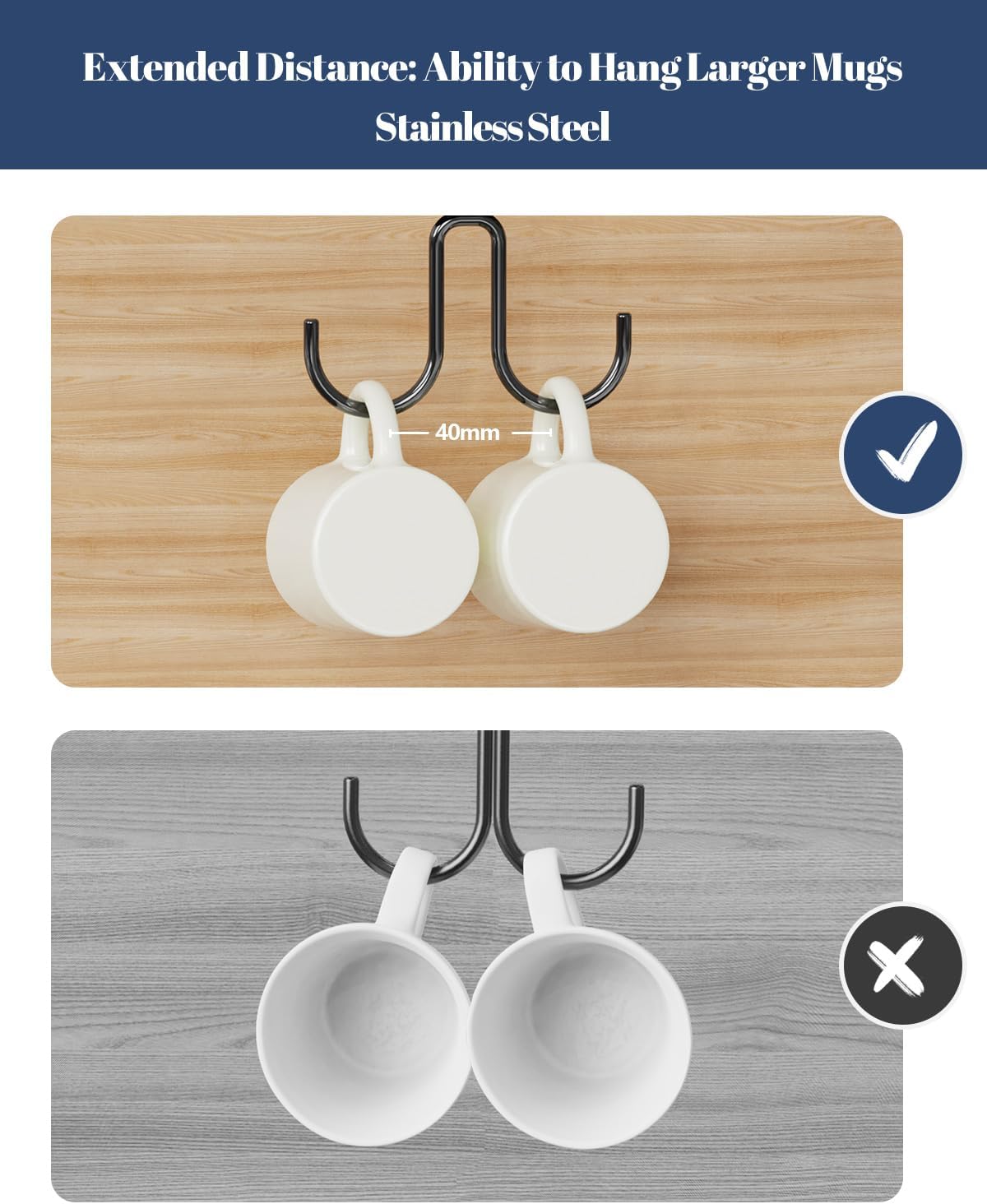 - Reasonable spacing: With a redesigned structure, the under cabinet mug holder has a more concise design and increased spacing between two cups, allowing for hanging larger diameter cups without overcrowding between the hooks.