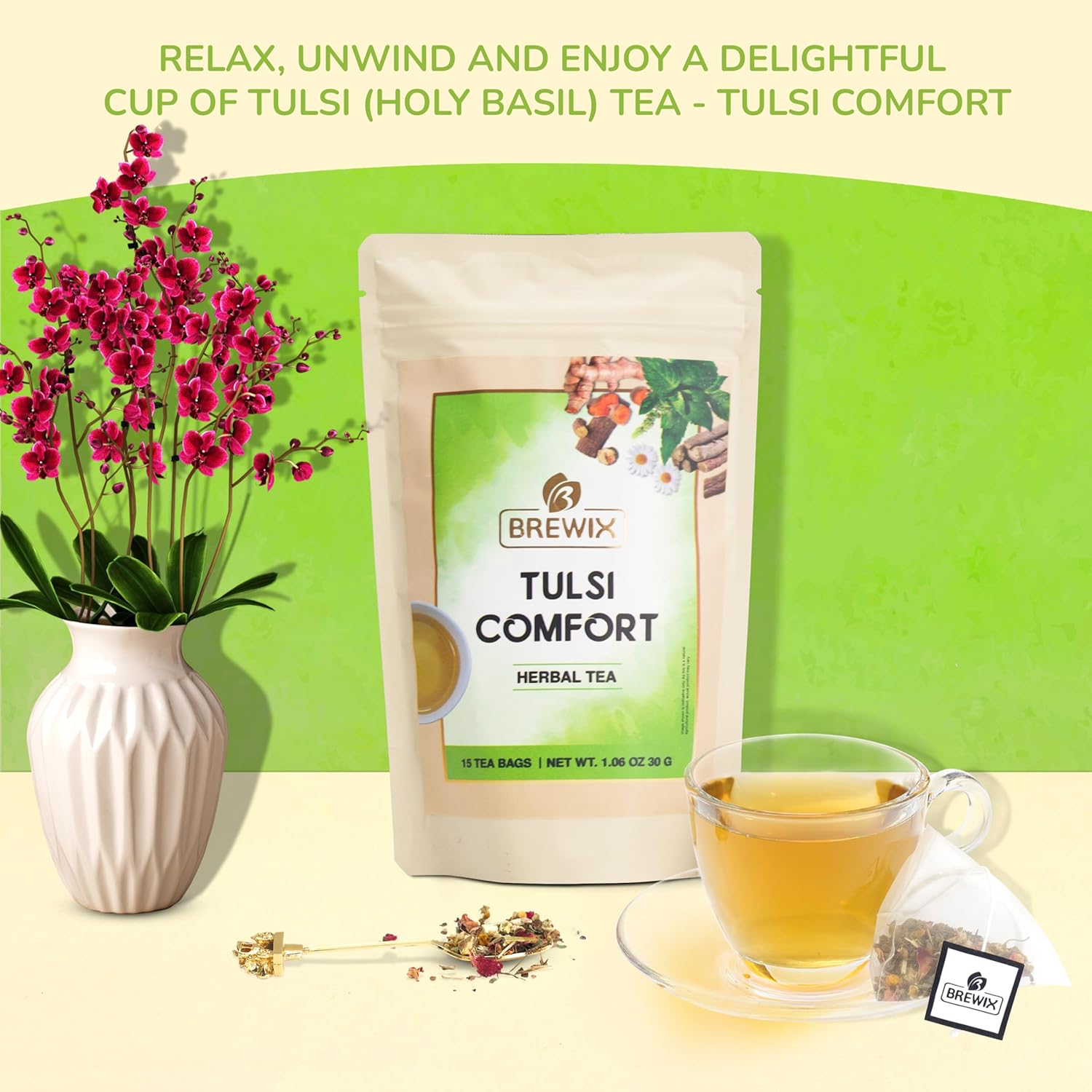 BREWIX Holy Basil Tea Bags (15 Pyramid Tea Bags) | Tee With Tulsi Leaves and Chamomile | Caffeine Free, Calming Herbal Tea With Fresh and Cool Flavor