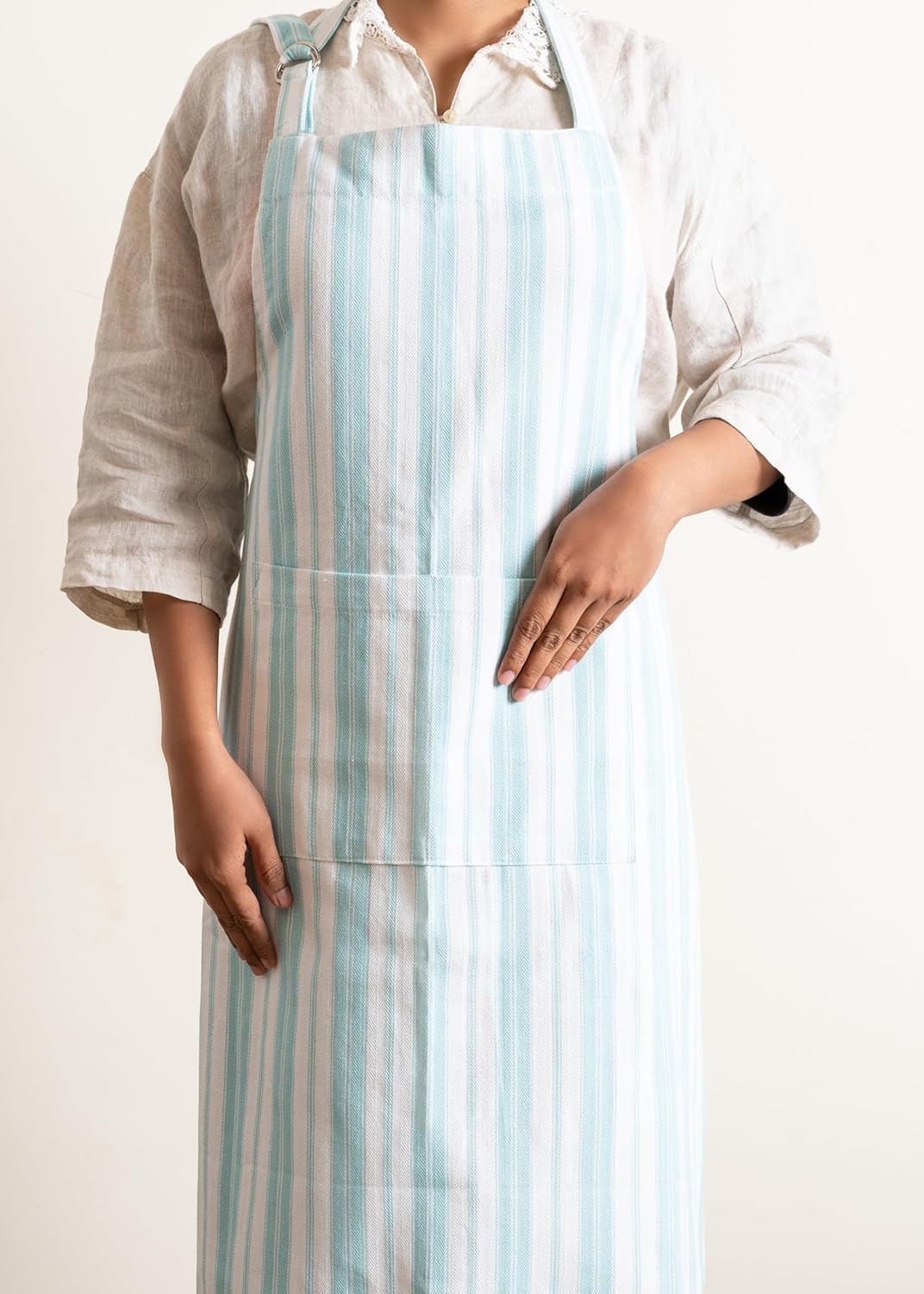 1 Oven Mitt, 1 PotHolder & 1 Kitchen Apron Set - Durable Heat Resistant Gloves - Thick Mittens for Kitchen - Suitable for Cooking, Baking, Grilling – Men & Women – Light Blue Stripes