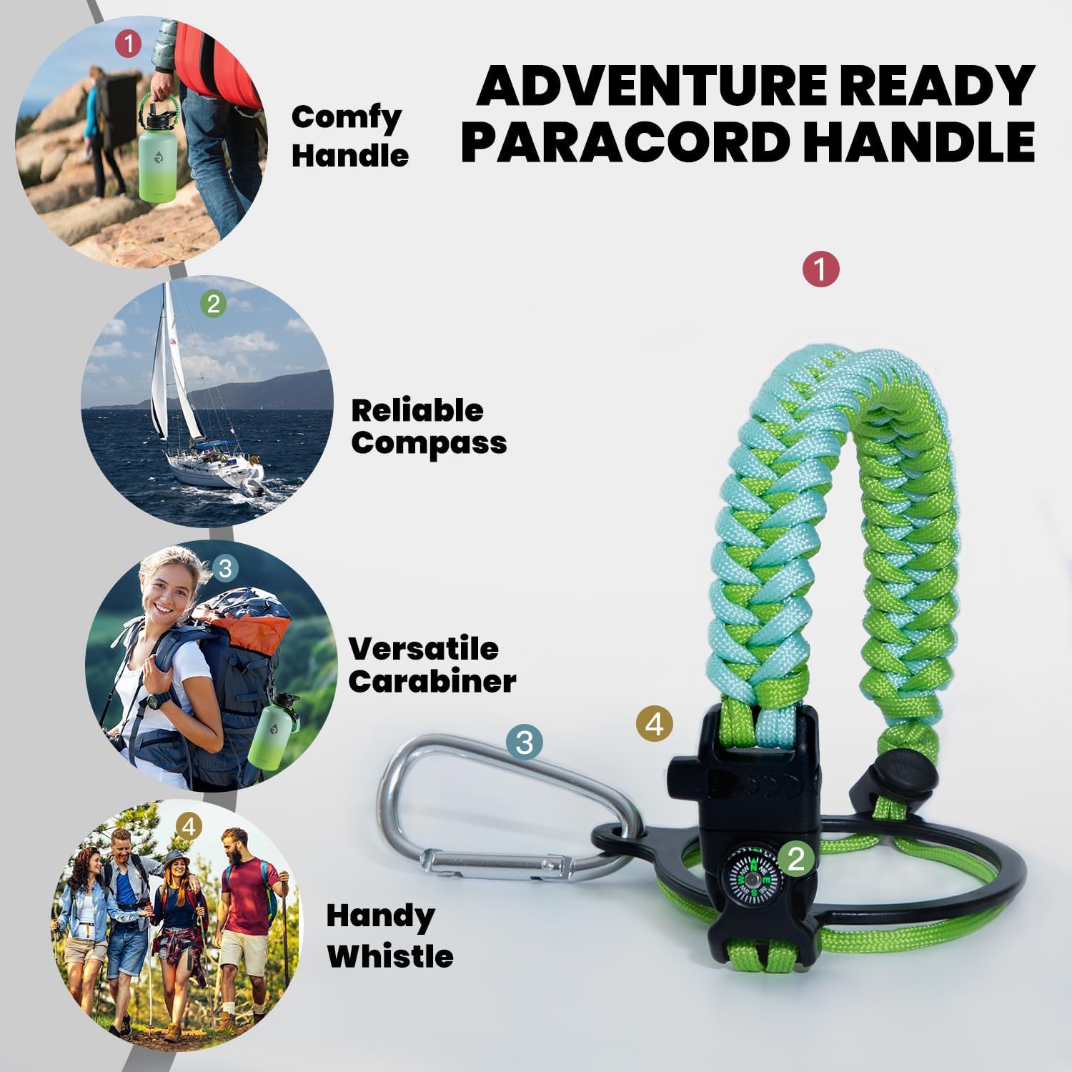 - Iconic Paracord Handle: This insulated water bottle comes with a beautiful hand knit nylon paracord in coordinated color with the water bottle. Configured with a compass and carabiner, this paracord handle is a must-have as a full functional camping / hiking flask