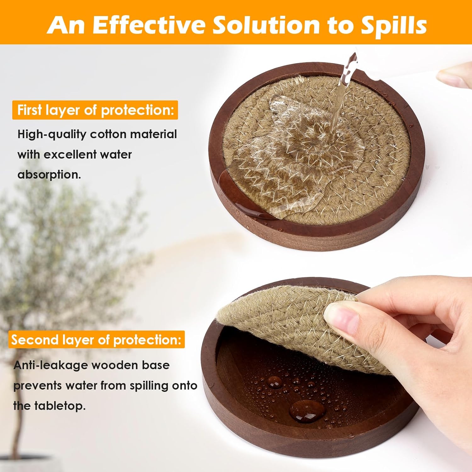 - Super Absorbent & Furniture Protection: Our coasters made of high-quality materials are thick and extremely absorbent. The double-layered coaster with cotton and wood absorbs more condensation, ensuring that water stains do not penetrate the tabletop or avoids scratches on the furniture. Furniture can be kept dry to prevent stains and water rings.