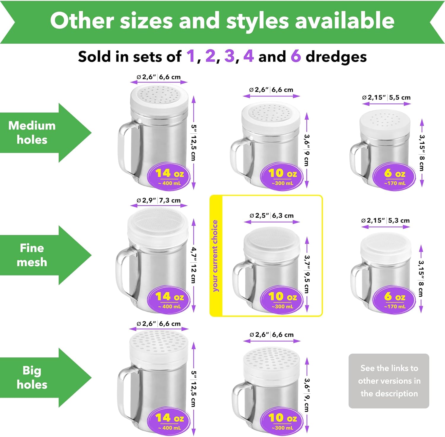 - You will receive stainless steel dredge (10 oz) with handle, twist-off lid and plastic cap; style: fine