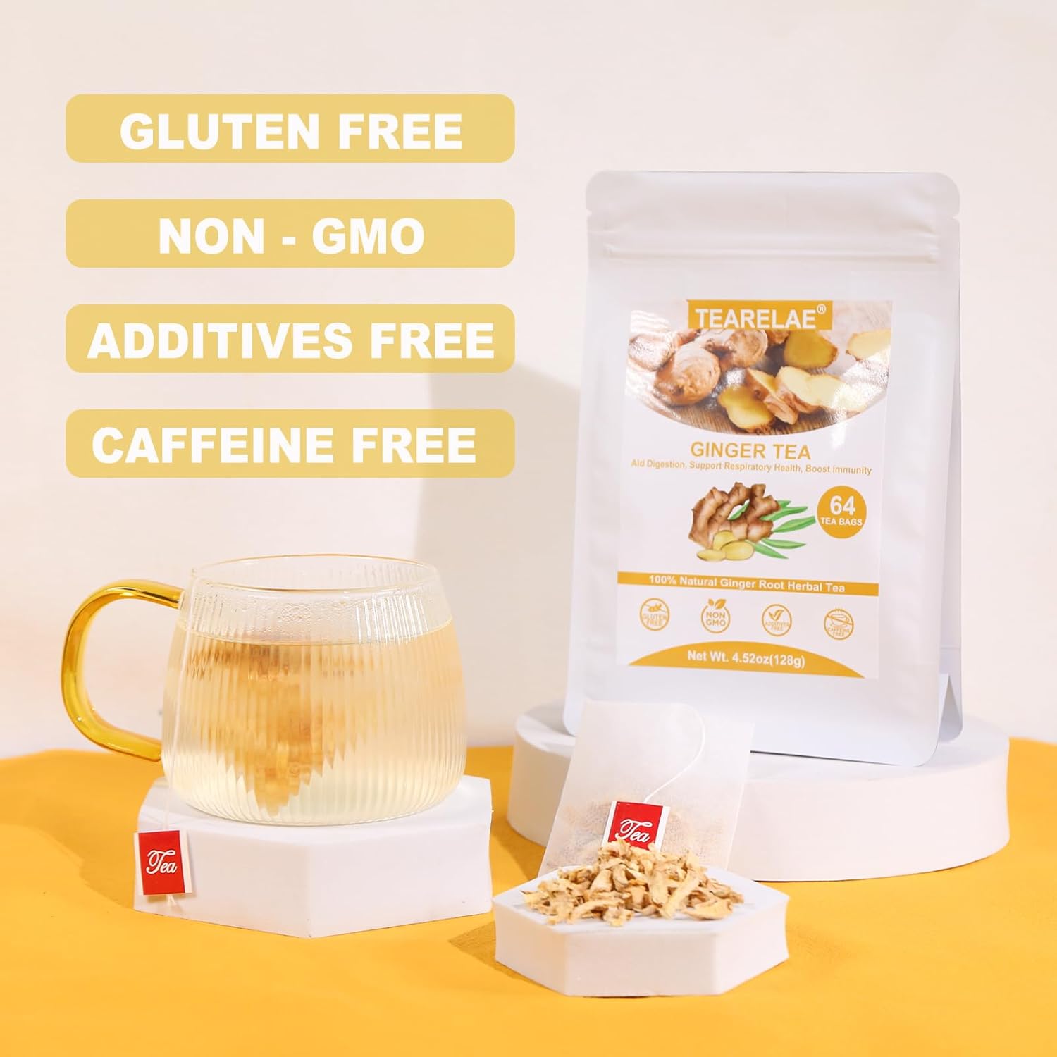 TEARELAE - Ginger Tea Bags, 64 Count - 100% Pure Ginger Root Tea, Soothing & Spicy - Non-GMO - Caffeine-free - Aid Digestion & Support Respiratory