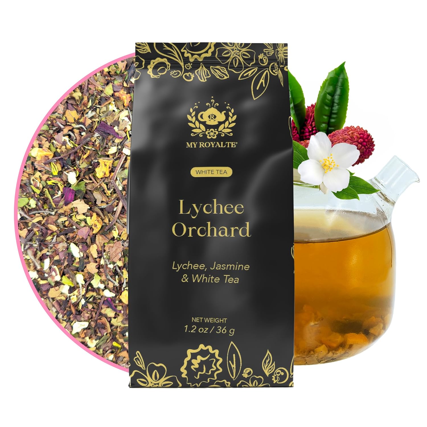 MyRoyalte Exquisite Jasmine Lychee White Tea Blend - 1.3 oz Fragrant White Tea Infused with Sweet Jasmine and Refreshing Lychee Flavors - 100% Natural Tea Gift For Tea Lovers
