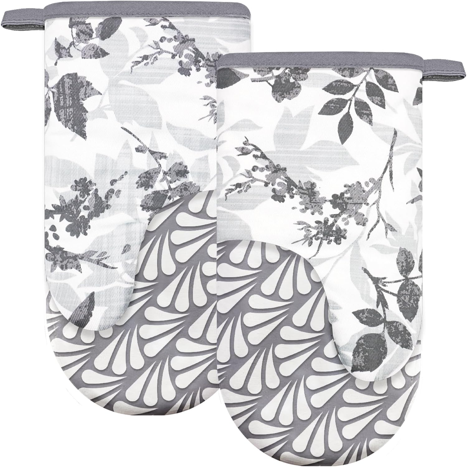 Thumb Oven Mitts, Heat and Slip Resistant Silicone Kitchen Mittens 2-Pack Set, Foliage Textured Flower Soft Long Oven Gloves, Flexible Thick Potholders for Safe Baking Cooking and Gr (Grayish)