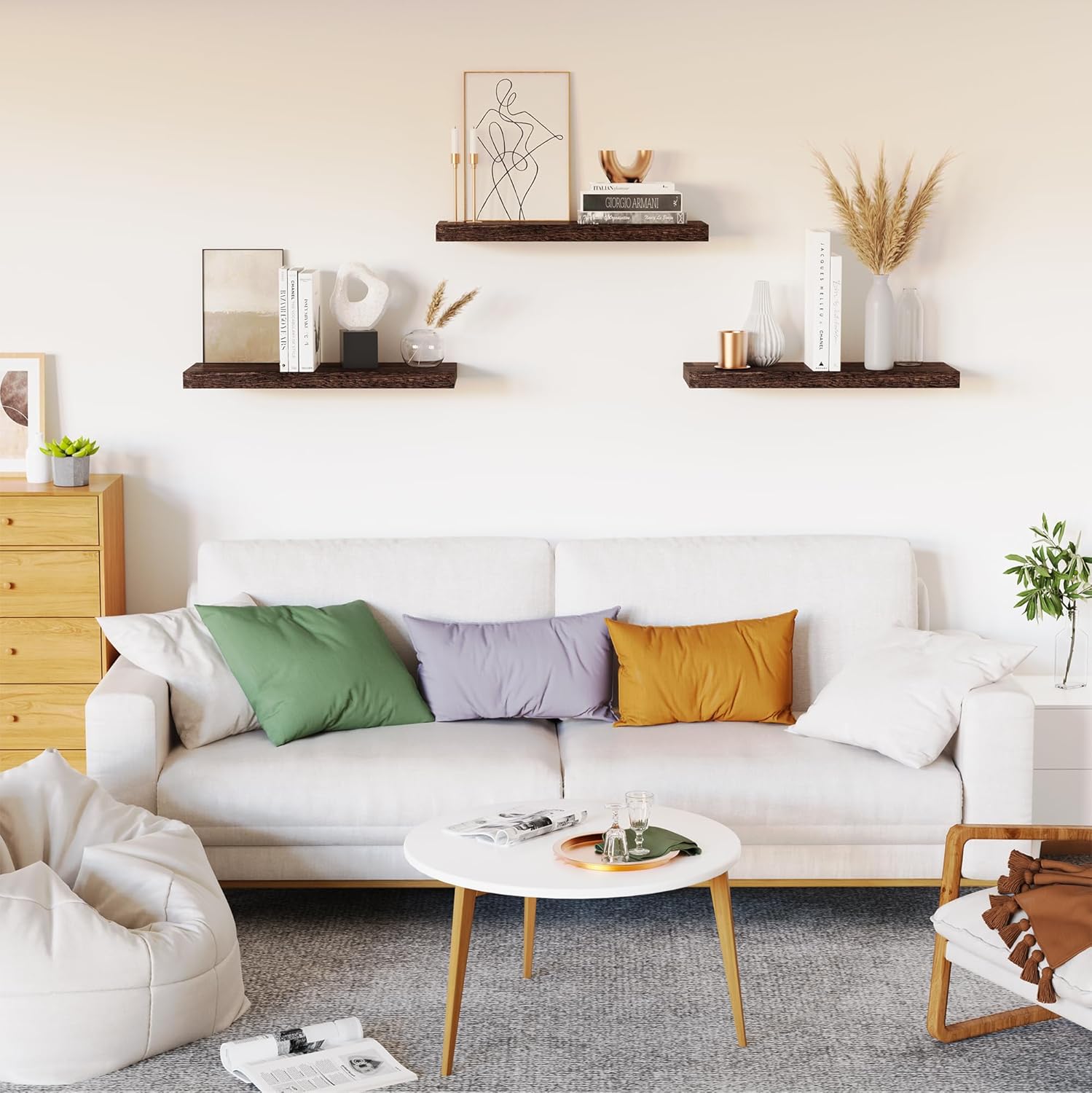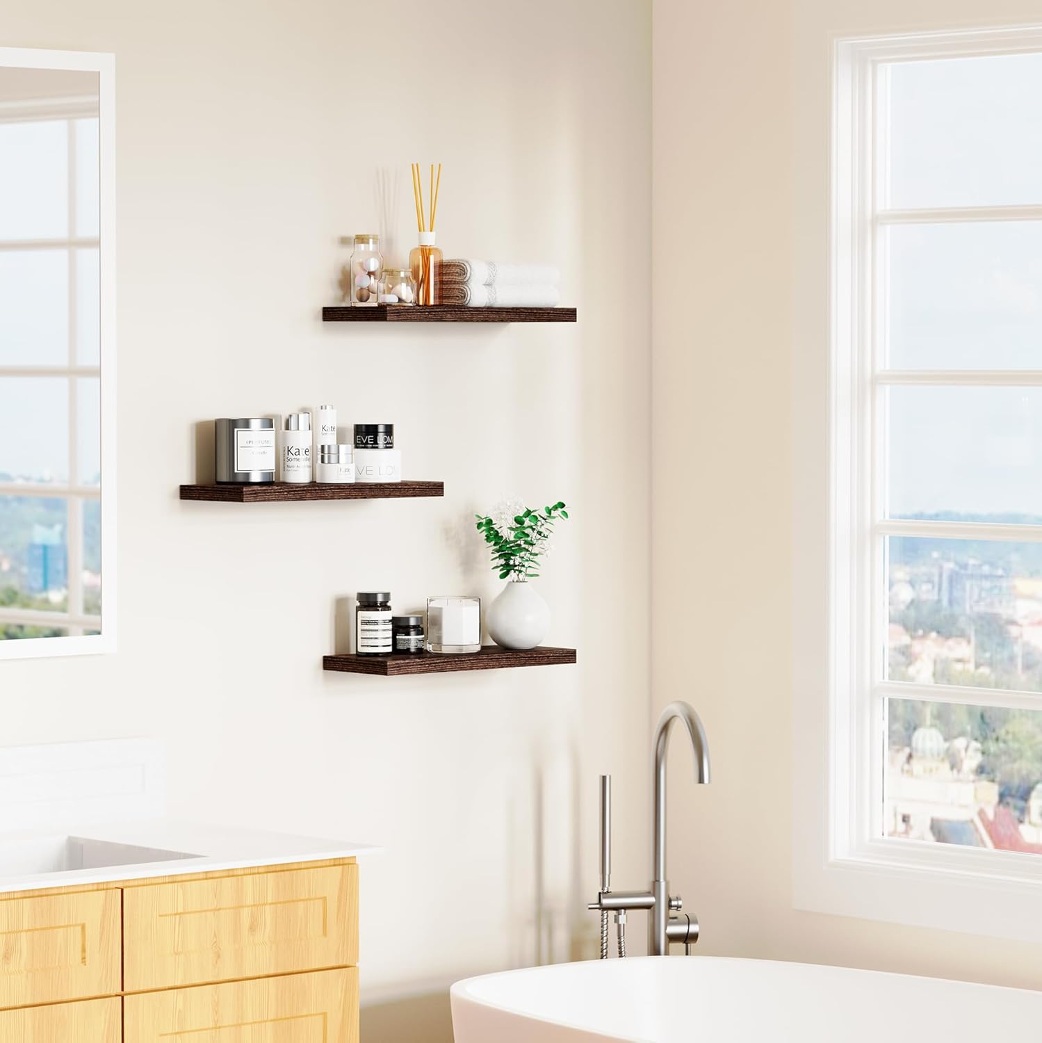 - 【Modern Concise Design】Our white floating shelves are designed with modern simplicity. It has streamlined look to bring modern style and vintage atmosphere to the home. Our wood floating shelves for wall is a set of 3 wall mounted shelves. Our rustic wood shelves can give us plenty of space for creativity, we can choose a line, a ladder shape, or a symmetric way. Let our floating shelf wood more suitable to the home decor and bring a better visual experience.