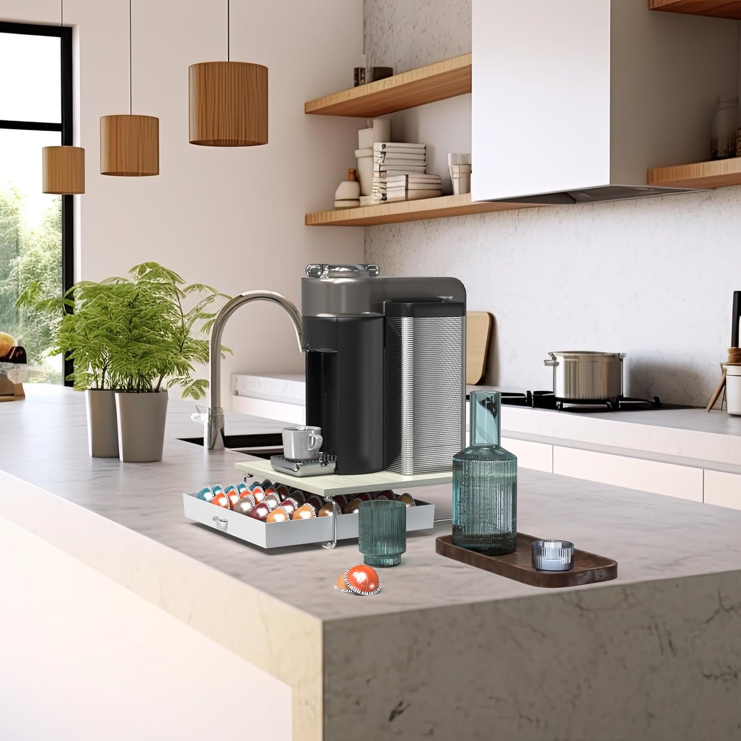- [ Sliding Drawer Design ] The sliding drawer mechanism allows easy access to your coffee pods, making selecting and using them convenient.