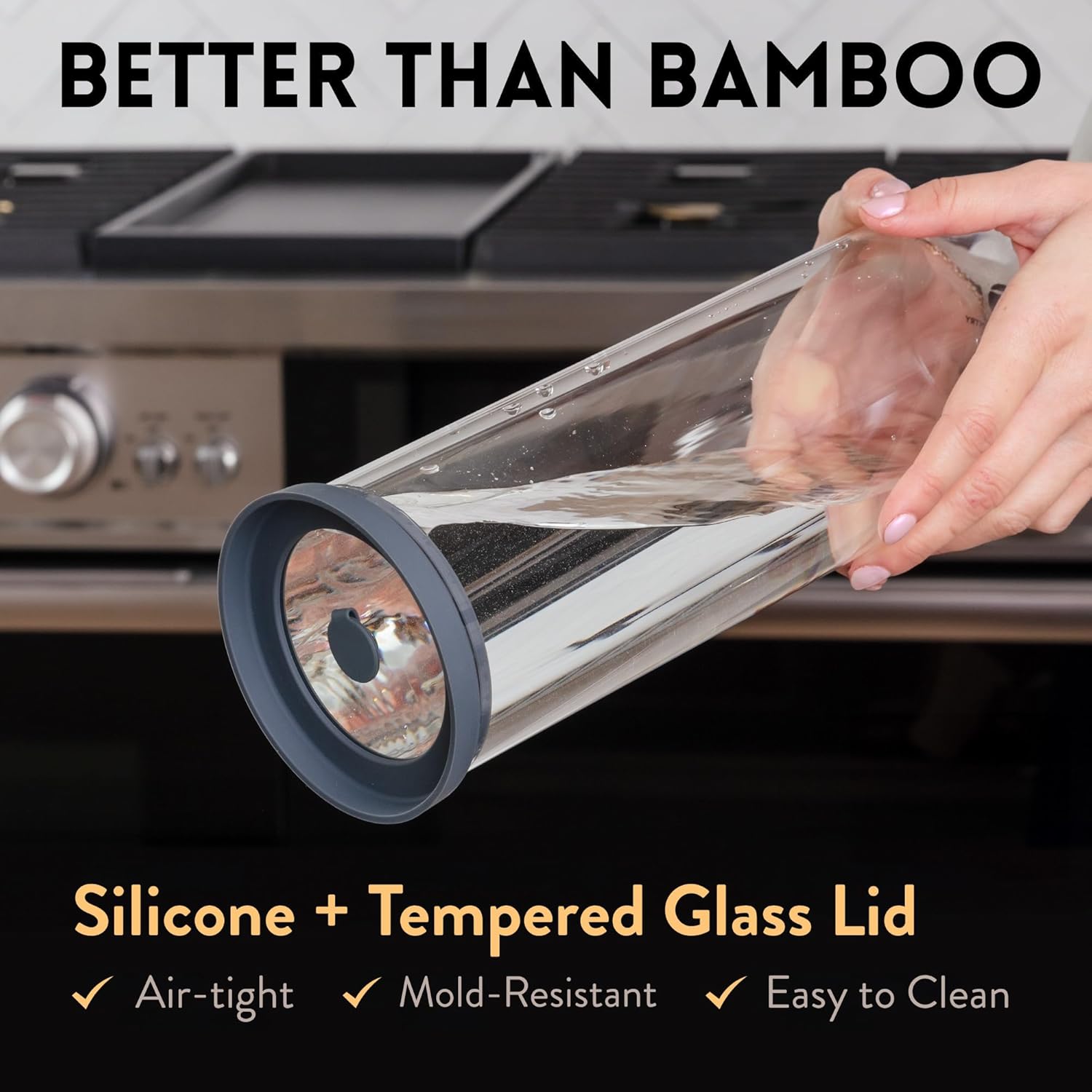 - Sophisticated Pantry Organizers: Each tall, round crystal-clear glass containera has a sealed lid in chic gray silicone for pretty and practical kitchen organizing