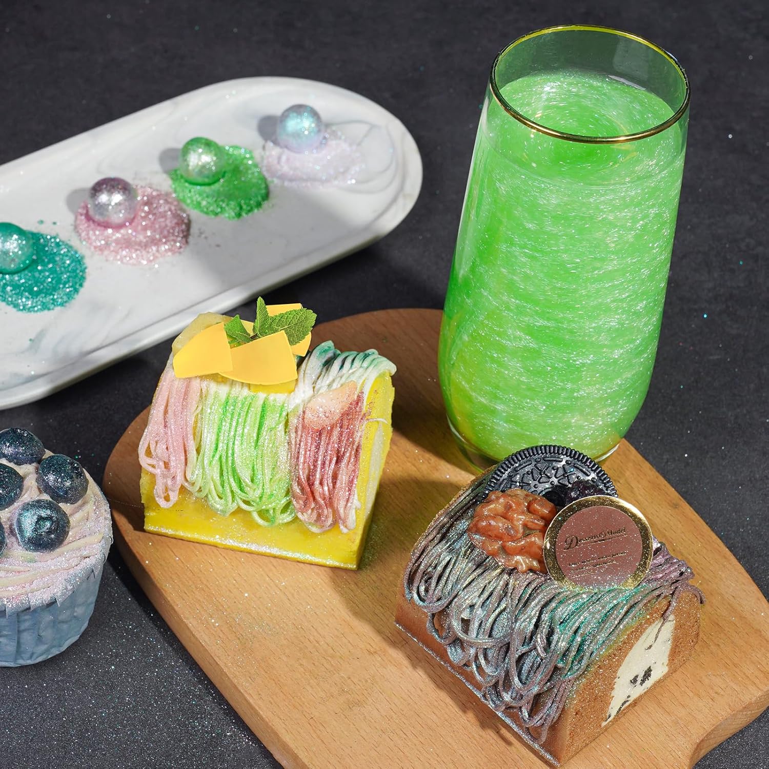 - 🌟【Use with Brews】Food-grade glitters are so fun and simple to use with brews. Add one pinch or two directly to your favorite beverage, mix it with cocktail syrups, juices, liqueurs, liquors, or spirits. Use a clear glass instead of opaque containers so that the liquid looks so cool, especially when you move it around in the glass with a stir. A tiny amount of dust can create a great visual spectacle, and clear liquids offer a great blank canvas for glitter to show off the best ability.