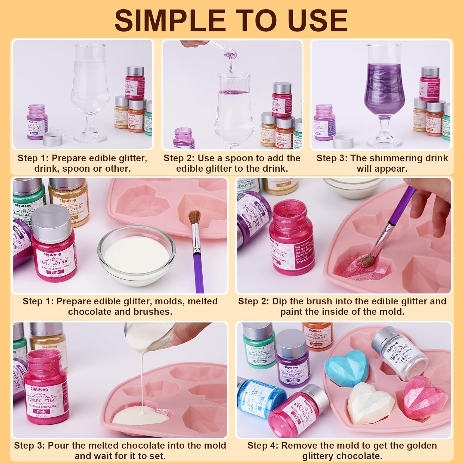 - Easy to Use - You can mix the glitter directly with drinks can make a starlight drink, or sprinkle it directly on cakes or desserts to complete the decoration, or use a brush to apply it directly on molds and pour it into chocolate. Enjoy the fun of DIY desserts and drinks!