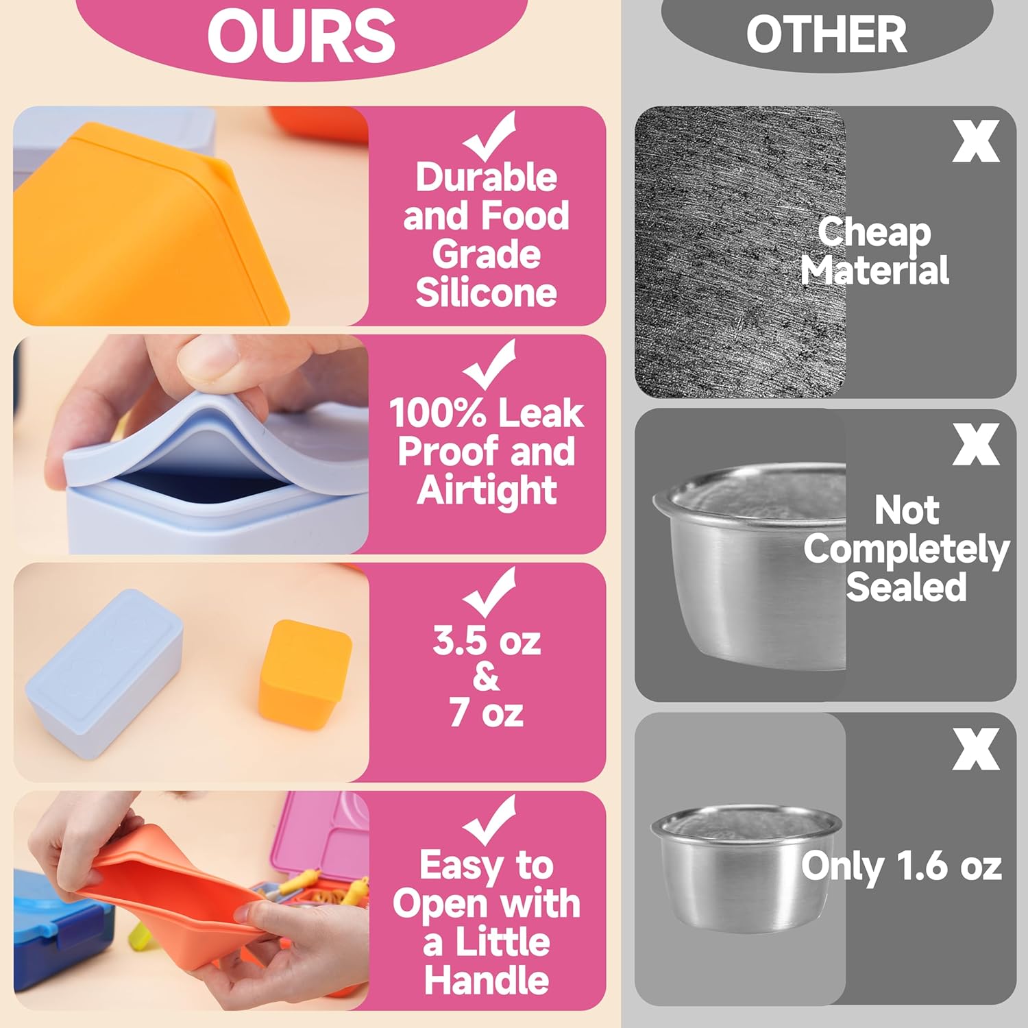- 💎【Food-Grade Silicone】VIOTIIN Dip Containers for food storage use premium food-grade silicone that is free of BPA, PVC, Latex and Phthalates. They are lightweight, durable and very convenient to carry on the go.