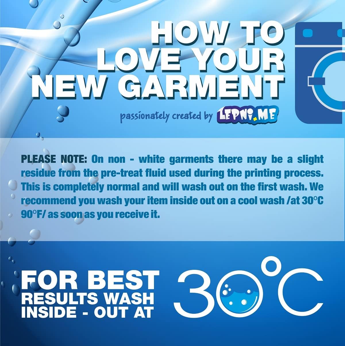 - Care instructions : Wash the Garment inside out in cool water 30°C