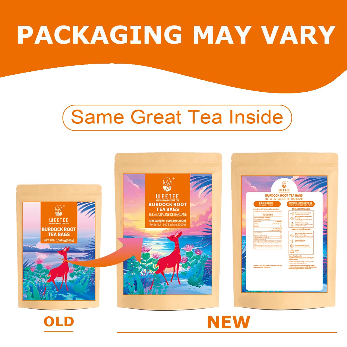 - 【Eco-Conscious Design】100 burdock root tea bags (unbleached and compostable, no staples, string, bags, or extra waste) packed in a resealable kraft paper bag to keep them fresh.