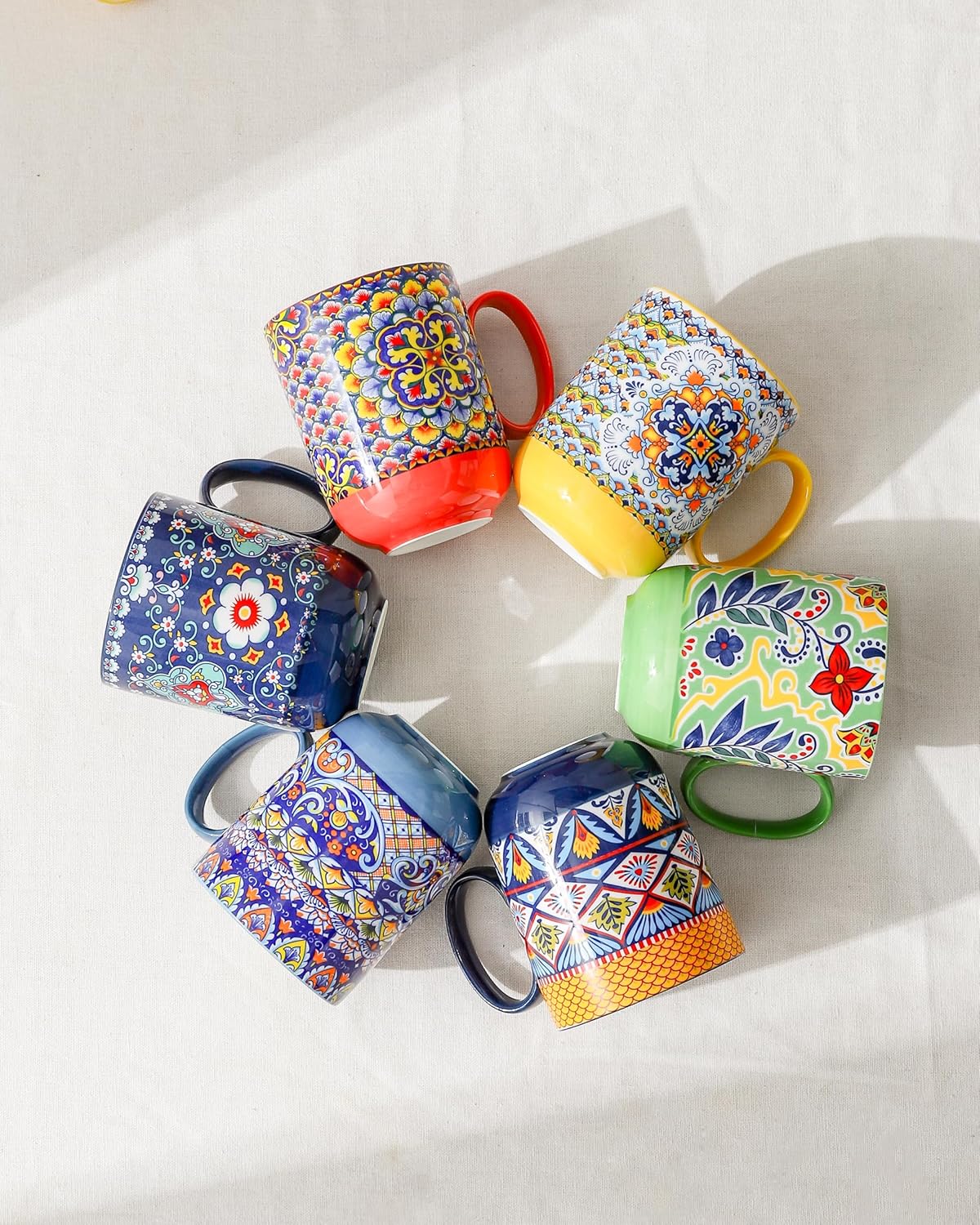 HENXFEN LEAD Coffee Mugs Set 14 Ounce - Multicolor Porcelain Cups for Latte, Hot Tea, Cappuccino, Cocoa, Soup, Dishwasher, Microwave Safe, Christmas Gift Set of 6 - Bohemian Style