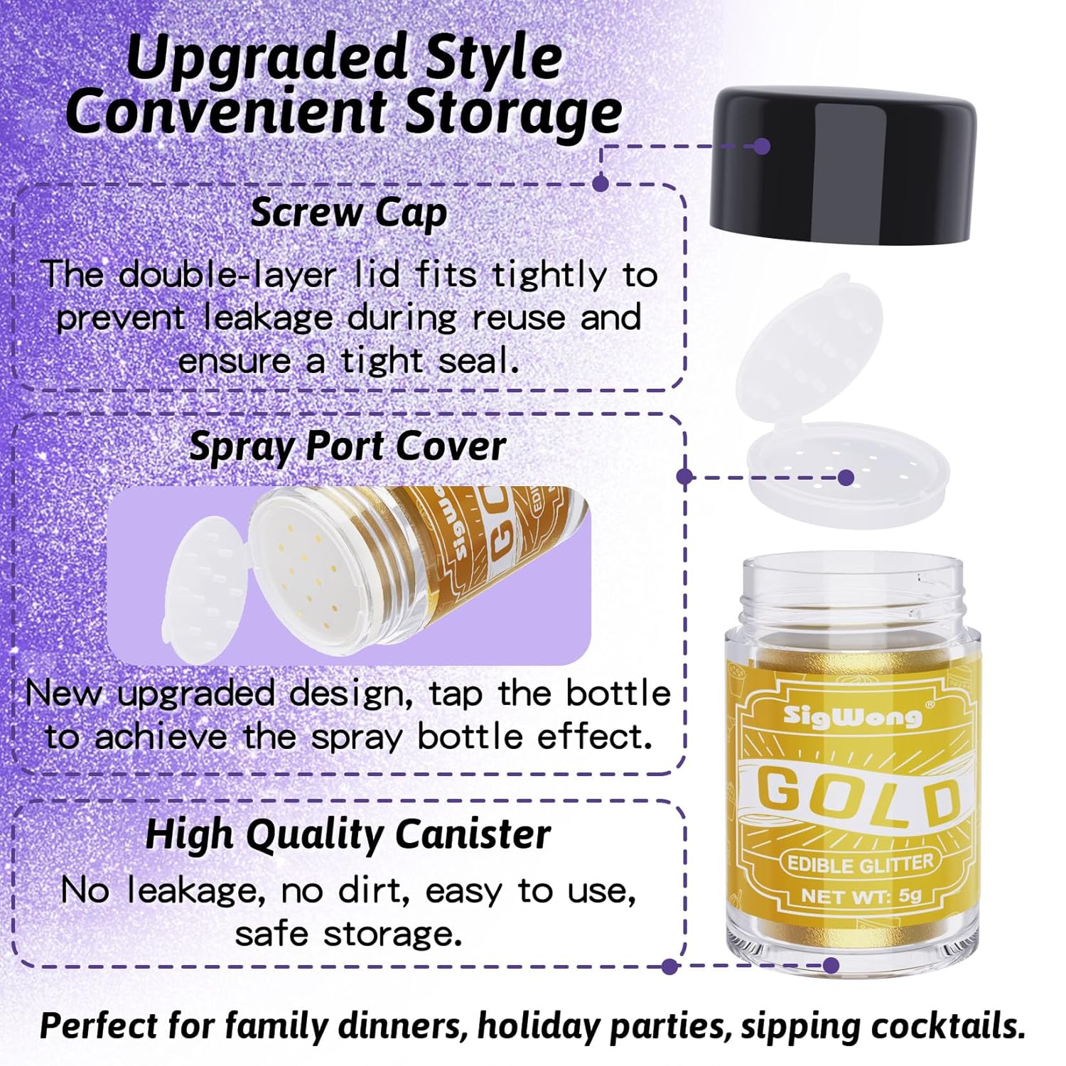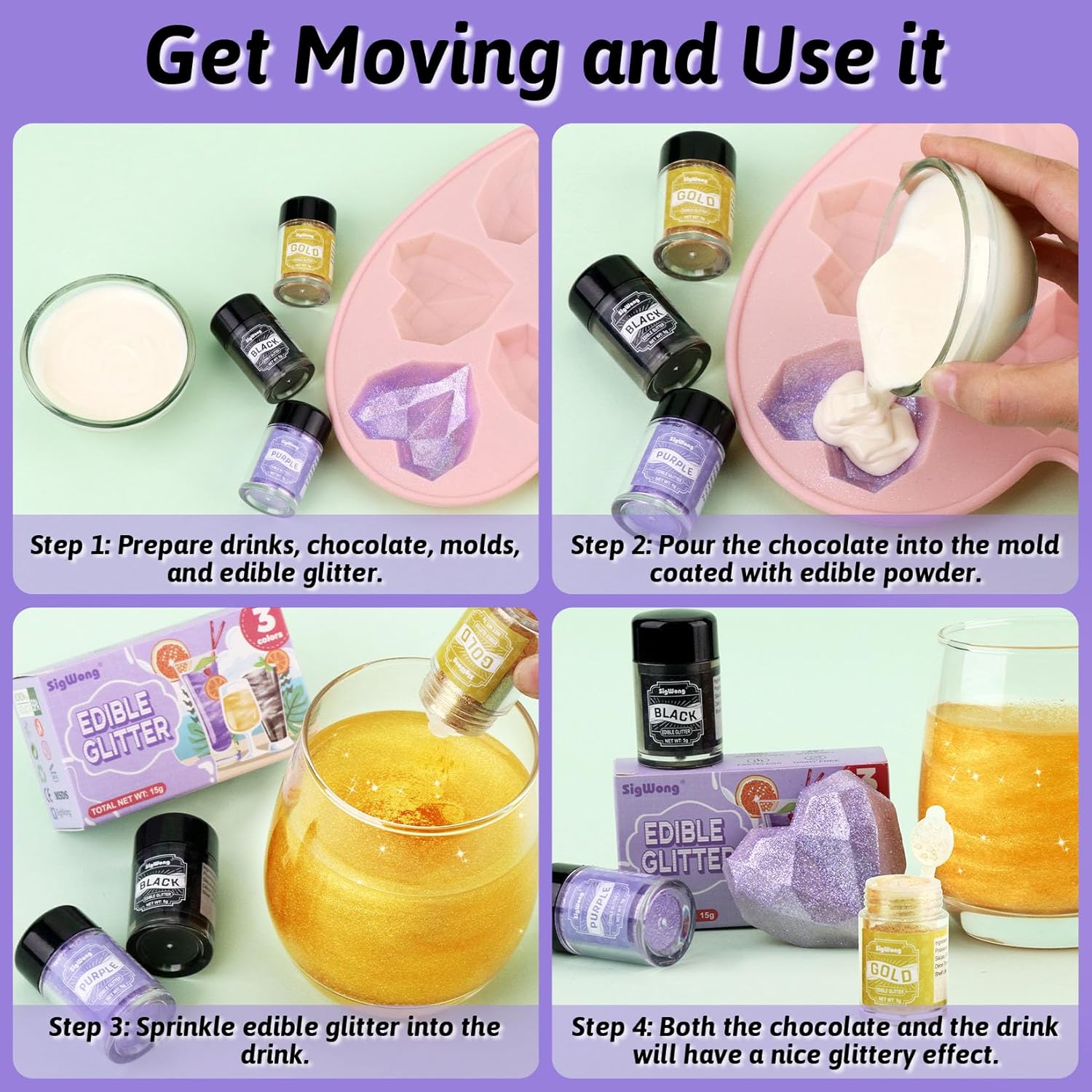 - Edible Glitter Set - 3 colors edible glitter for drinks ( purple, black, gold ). 100% edible food-grade glitter powder in 0.18 oz/5 g size to meet your needs in breweries, distilleries, restaurants and food service industry.