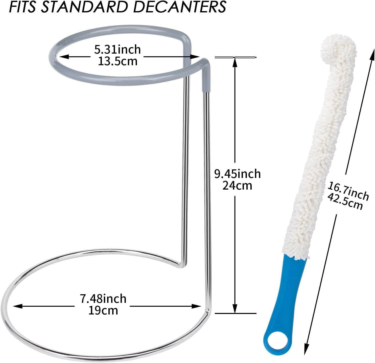 - 🍷【Fits Standard Decanters】The decanter drying stand measures 9.45" tall, with a 7.48" diameter bottom base, and a 5.31" diameter inside top. 17.3'' long brush for long neck wine decanter with Max bottle mouth diameter of 1.57in. The decanter drying rack is also a great decanter display rack, looking great in home decor.