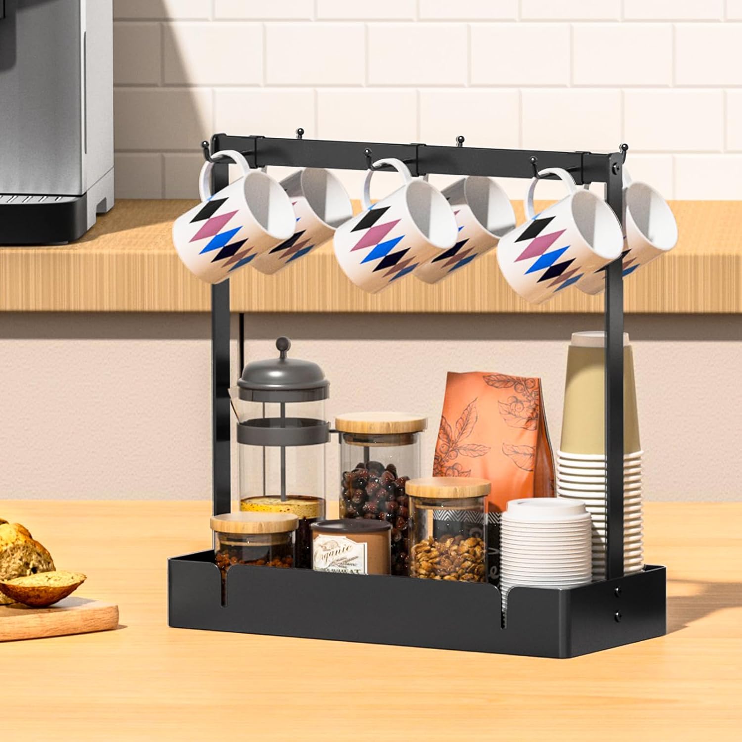 - 【Large Storage Coffee Mug Holder】 - 6 mug hooks and large capacity tray. RCHYFEED coffee cup organizer owns large capacity, the top shelf with hooks holds up to 6 coffee mugs. The bottom storage tray can hold various coffee beans, syrup, coffee cups, sugar bag, tea packet, creamer, snacks and other various items. A great coffee bar accessory.