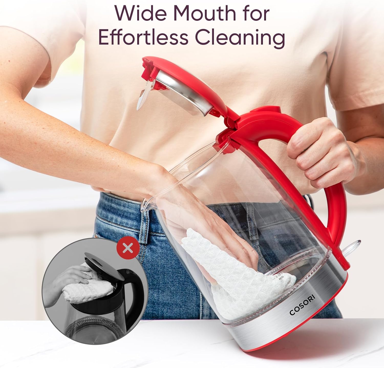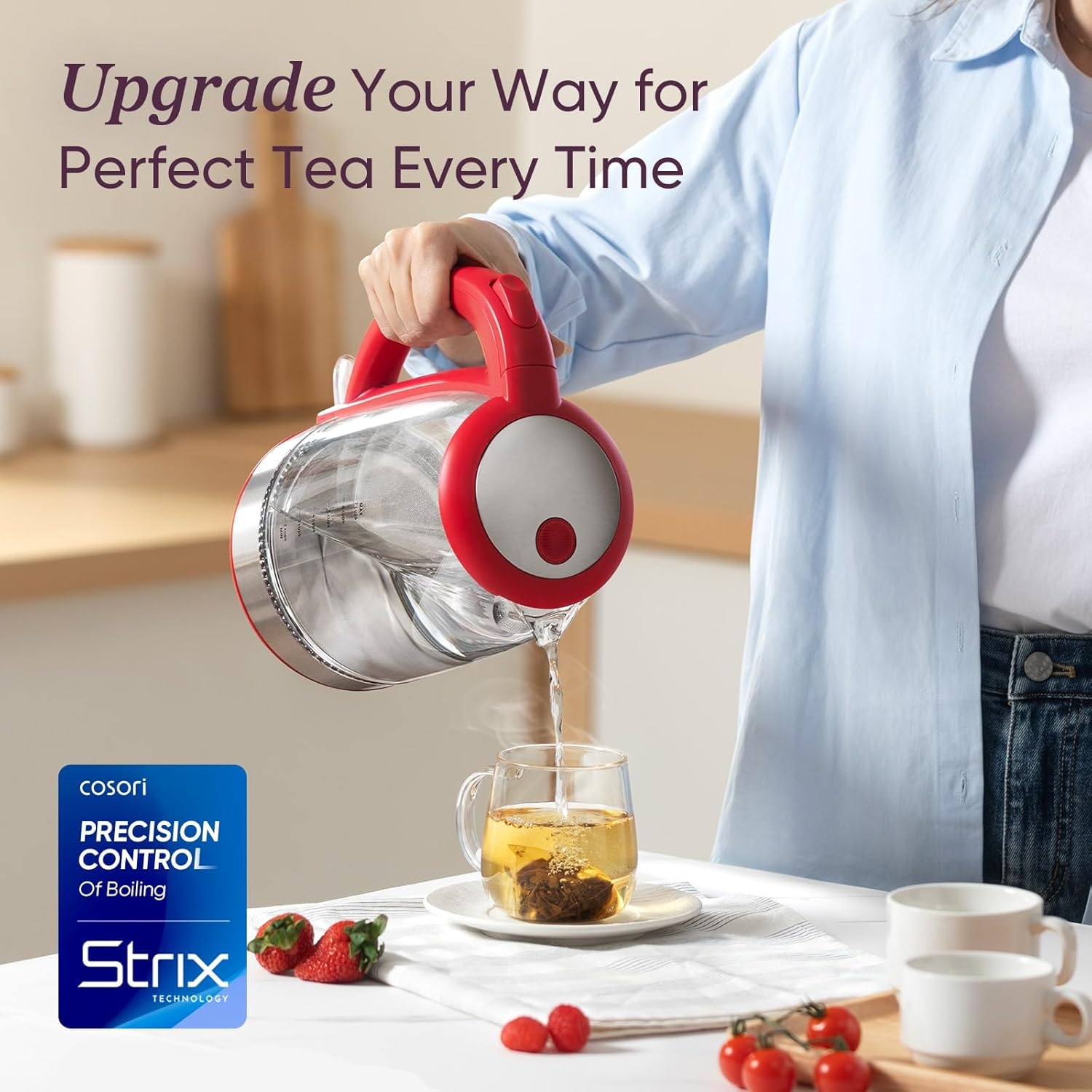 Cosori Electric Kettle, No Plastic Filter & Spout, Tea Kettle & Hot Water Boiler For Coffee & Tea, Water Heater & Teapot, Automatic Shut Off, Borosilicate glass, Red, 1.7L/1500W
