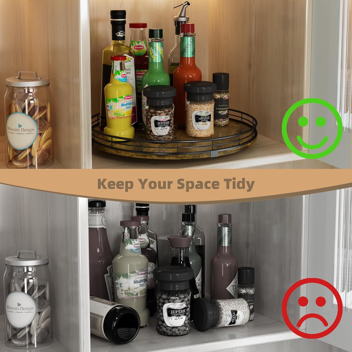 - 360°Smooth Rotation - The lazy susan turntable rotates smoothly and silently, placed next to the stove for easy access to condiments, spices, olive oil and cooking supplies. Placed next to the sink to display soap lotion. Thoughtful kitchen countertop organizers to rid your life of clutter!