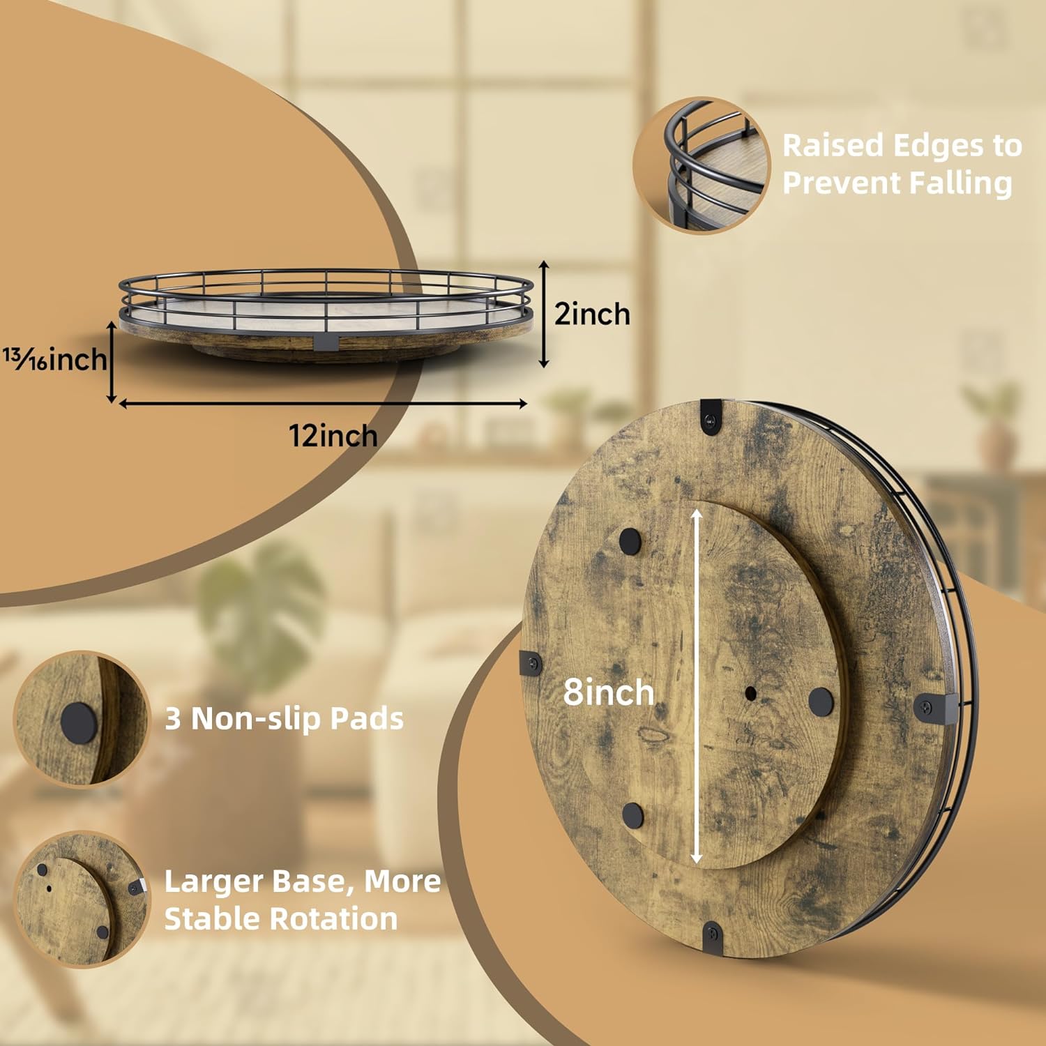 - Thoughtful Design - The raised edges are made of iron, which is sturdy and prevents items from falling off the turntable. The base is large enough and equipped with 3 anti-slip pads, the rotation is smoother and prevents scratches. No installation required, easy to use