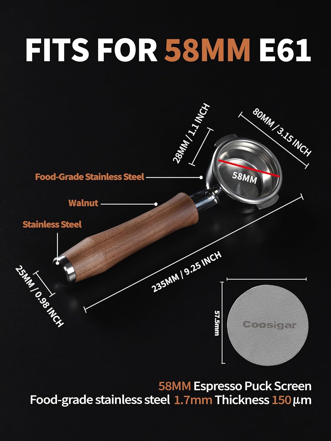 - Crafted with Food-Grade Stainless Steel and Natural Walnut wood Handle - The portafilter head is cast in food-grade stainless steel and highly polished by manual craftsmanship to ensure a snug fit with the coffee machine. The portafilter handle is made of 100% natural Walnut wood, providing a smooth surface and ergonomic design for a comfortable and natural grip, reducing strain on wrists and hands. This ensures a comfortable experience during extended brewing sessions.
