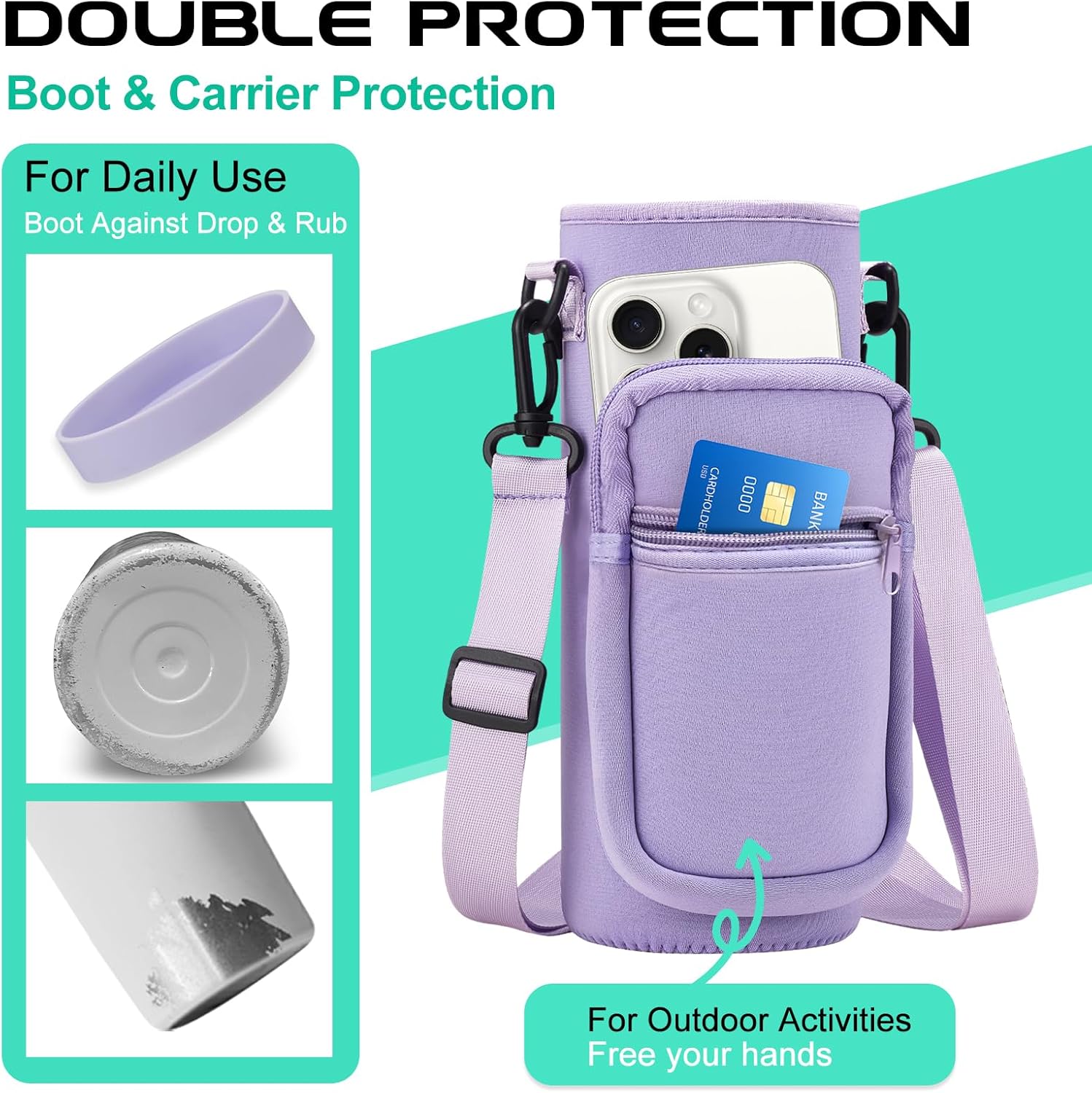 - PROTECTIVE BOOTS & STORAGE CARRIER BAG: Upgraded silicone boots prevent shattering and cracking when stainless steel water bottle accidental dropped. The storage carrying pouch made with neoprene material provide extra protect & insulation for your travel water bottle, 2 zippered pockets design to stores cards, keys and phones of any size