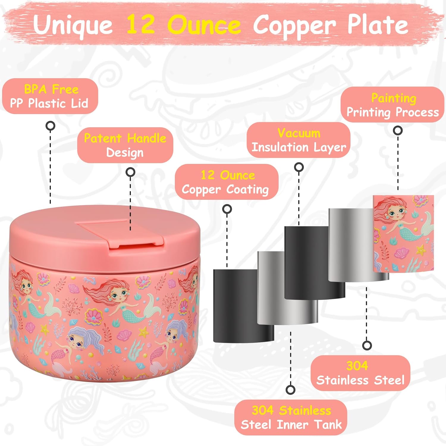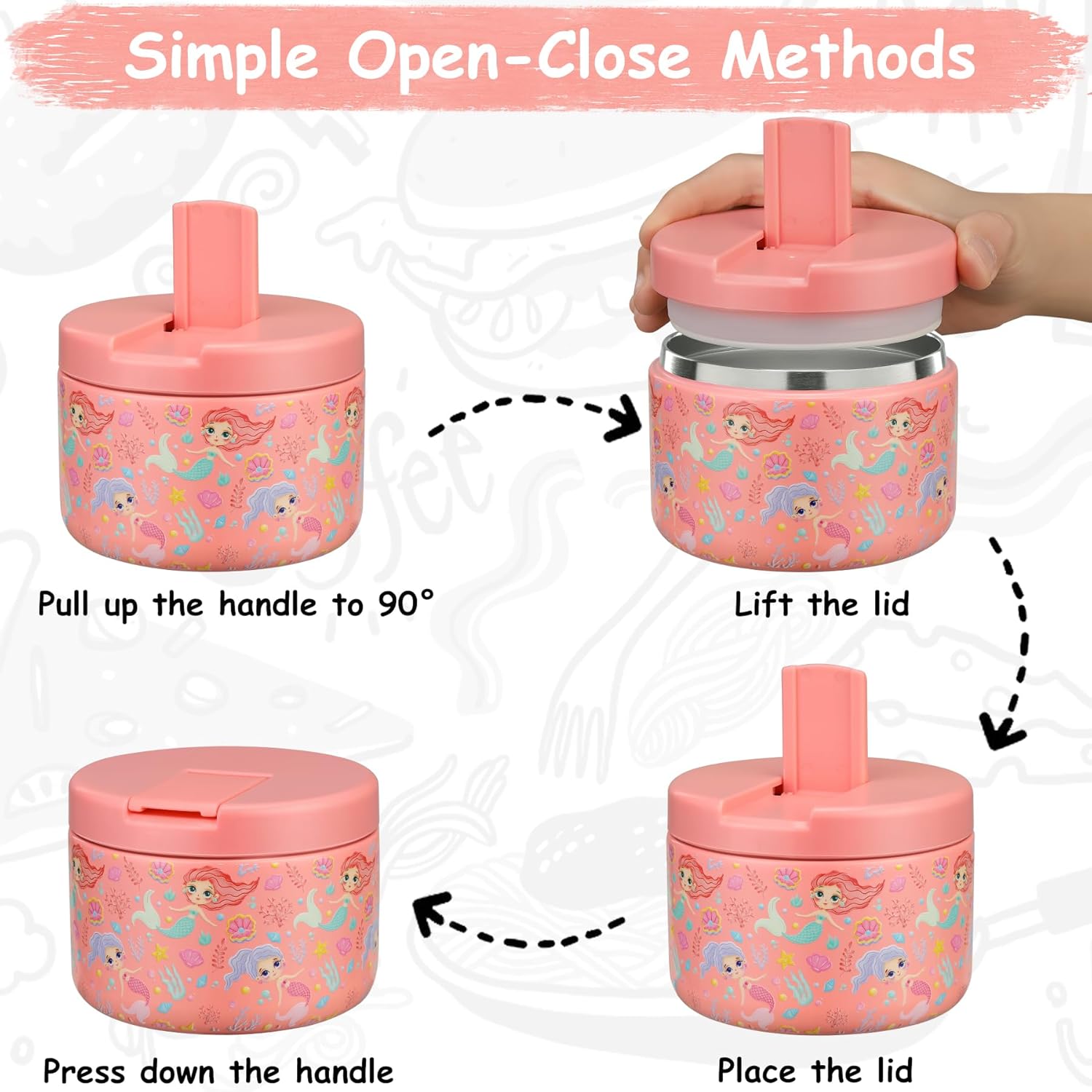 12oz Insulated Vacuum Food Jar with Buckle Lid Wide Mouth Soup Thermo for Hot Food Kids Leakproof Stainless Steel Lunch Container (mermaid)