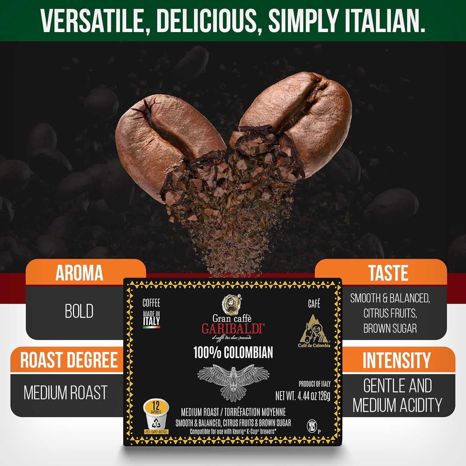 Caffè Garibaldi Colombian Coffee Pods, for Keurig K-Cup Brewers, Single Serve Cups, 100% Arabica Blend for Coffee Makers, 72 Count Recyclable Pods - Medium Roast