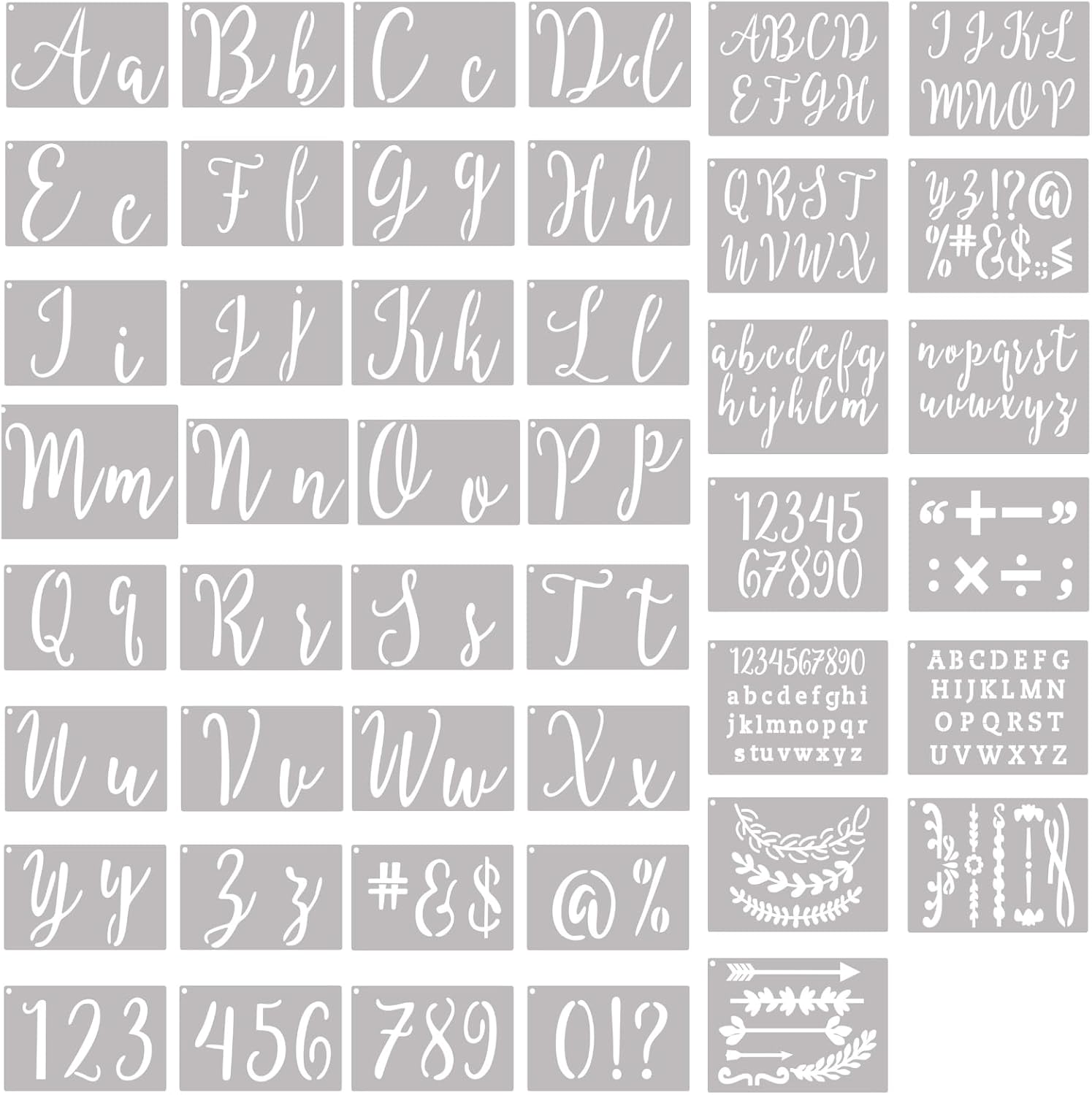 - Most complete bundle - 45 Pcs stencils contains over 175 characters ( 3 Sets of Letters, each with 26 uppercase letters and 26 lowercase letters, 3 Sets of numbers, each with 10 figures, 26 Common Signs and some patterns) and 1 Pcs Metal Ring