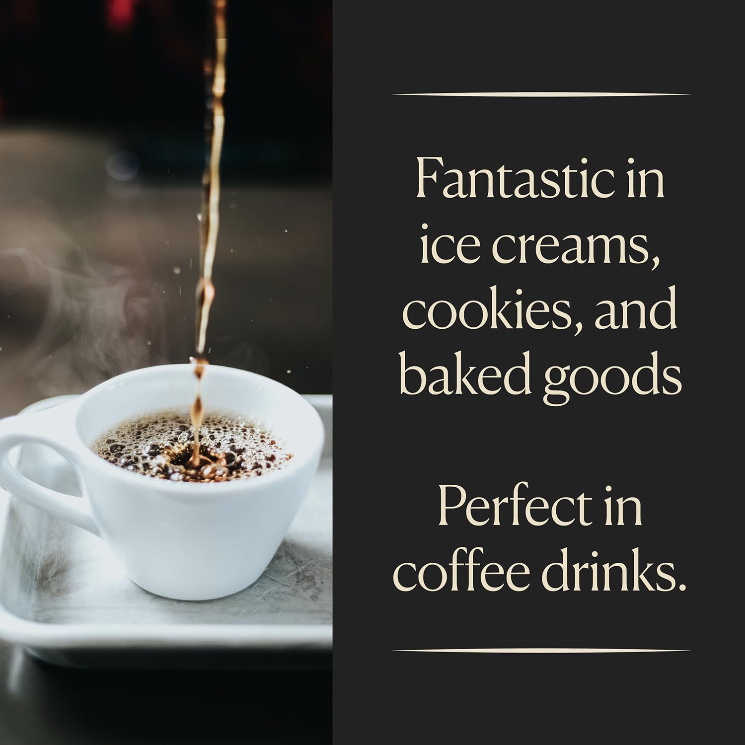 - Intense aroma with a smooth, buttery palate. Fantastic in ice creams, cookies, pastries and cakes. Holds its own with strong ingredients like chocolate. A favorite in coffee drinks.