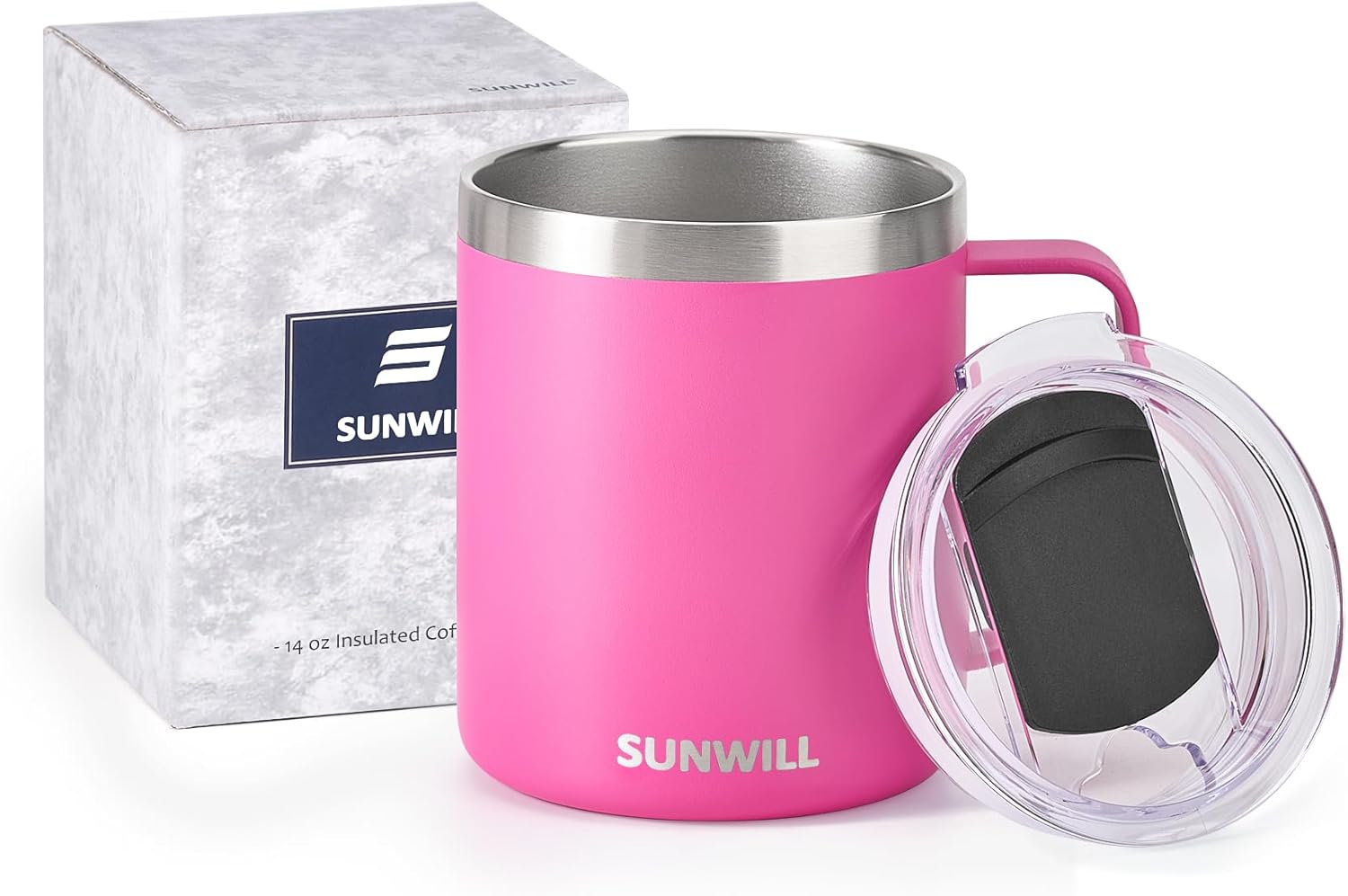 SUNWILL Insulated Coffee Mug with Lid, Travel Tumbler with Handle, 14 oz Stainless Steel Cup for Home, Office, Camping, Powder Coated Magenta