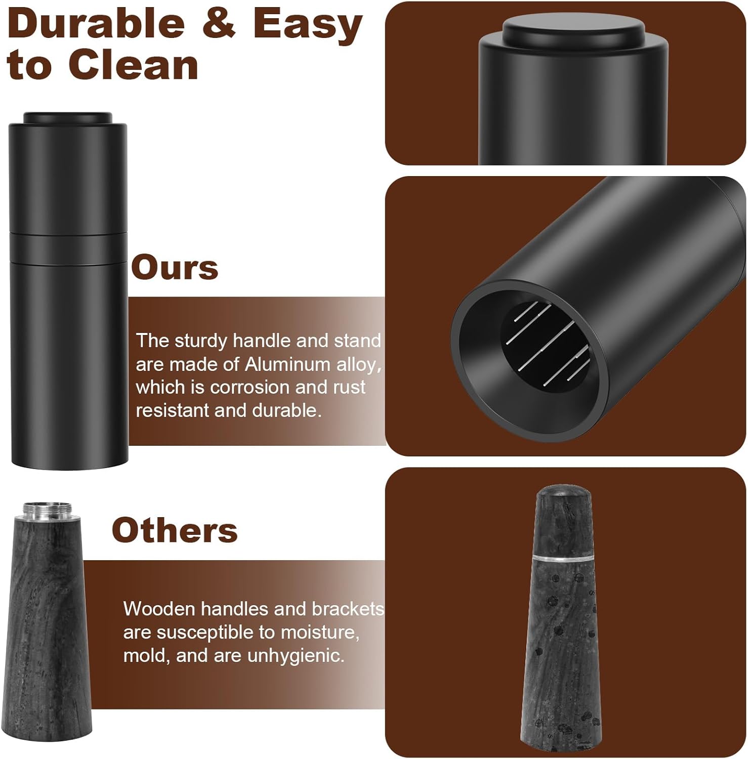 - Hygienic and Easy to Clean---The TIVERAIN Espresso distributor tool sturdy handle and stand are made of Aluminum alloy. The steel needle is made of high quality 304 stainless steel, which is corrosion and rust resistant and sturdy.The base adopts hollow design in the middle, can be washed directly, will not accumulate coffee grounds, convenient cleaning and hygienic.