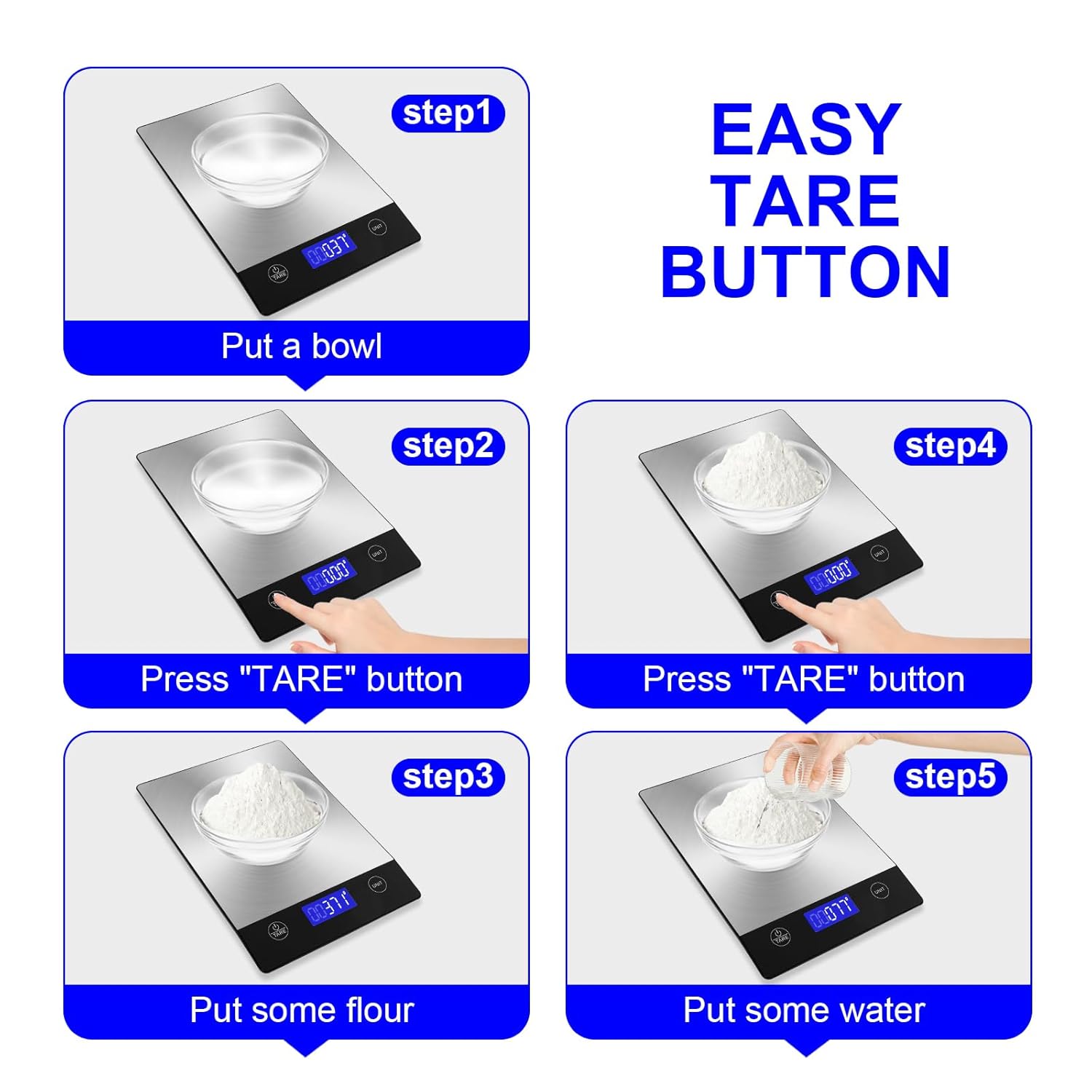 - Smart Baking Scale: Includes 2-minute auto-off to save power. Alerts for low battery and overload. Features 4 anti-skid rubber feet. Made of food-grade stainless steel, resistant to corrosion and scratches. Waterproof design for easy cleaning, ideal for daily kitchen use.
