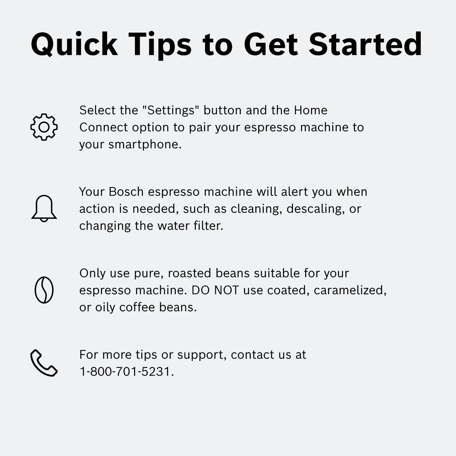 - WHAT'S IN THE BOX: 1 x Bosch VeroCafe 800 Series Fully Automatic Espresso and Coffee Machine TQU60307, 1 x Mavea Water Filter, 1 x Mavea Water Filter Insertion Aid, 1 x Microfiber Cloth, 1 x Set (2) Cleaning and (1) Descaling Tablets, 1 x Milk Adapter, 1 x Integrated Milk Container, 1 x User Manual, 1 x Water Hardness Test Strip
