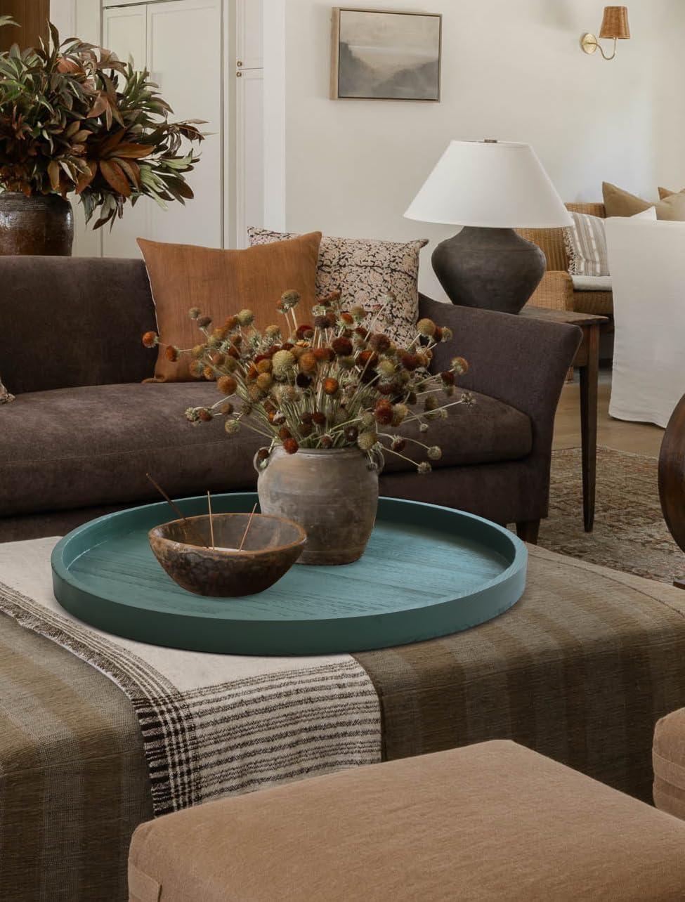 Round Ottoman Table Tray Round-24 - Rustic Wooden Serving Tray for Farmhouse Decorative Oversized Coffee Table Trays Living Room Kitchen Counter Breakfast Green
