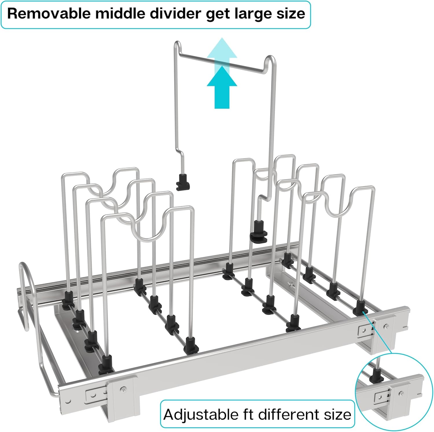 - Adjustable Metal Dividers: Offering a rich array of uses for your kitchen, organizers for kitchen cabinets features adjustable wires to accommodate various sizes and types of pots and pans. You can customize the dividers according to the size of your pans and pots flexible. Each cookware has a dedicated space to keep it neat and organized while preventing scratches and damage. The shelves are easy to remove and install. By removing the dividers, the shelves can easily be transformed into drawe