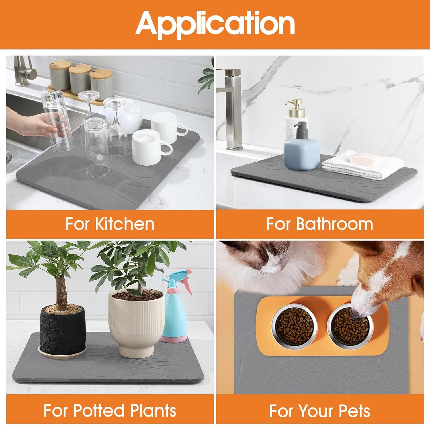 - 𝐌𝐮𝐥𝐭𝐢-𝐏𝐮𝐫𝐩𝐨𝐬𝐞: This diatomaceous mat is not only perfect for drying dishes but also ideal for holding vegetables, fruits, potted plants, and pet bowls, ensuring your home remains clean and organized