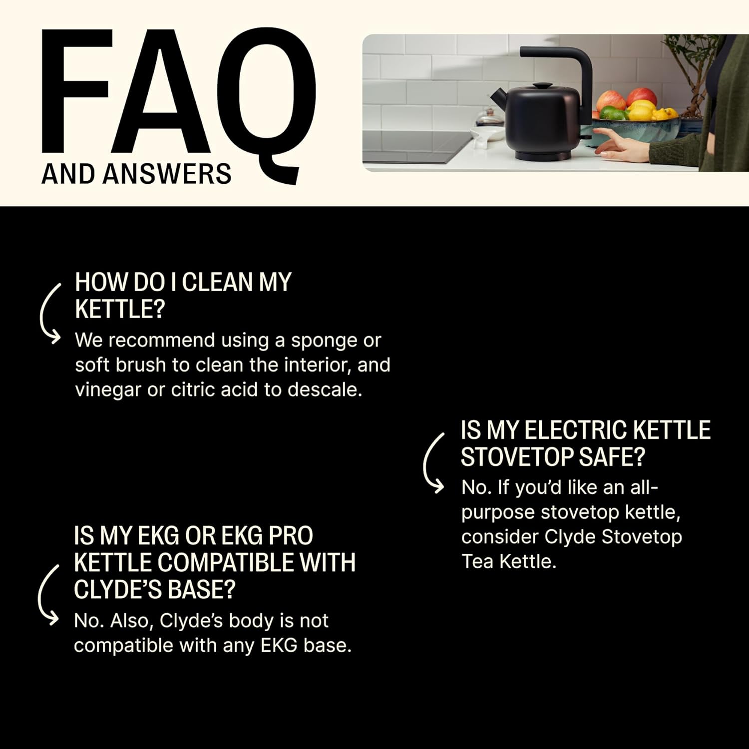 - CLYDE ELECTRIC KETTLE - A classic stovetop teapot design transformed into a modern all-purpose electric kettle and here to make a statement on your countertop.