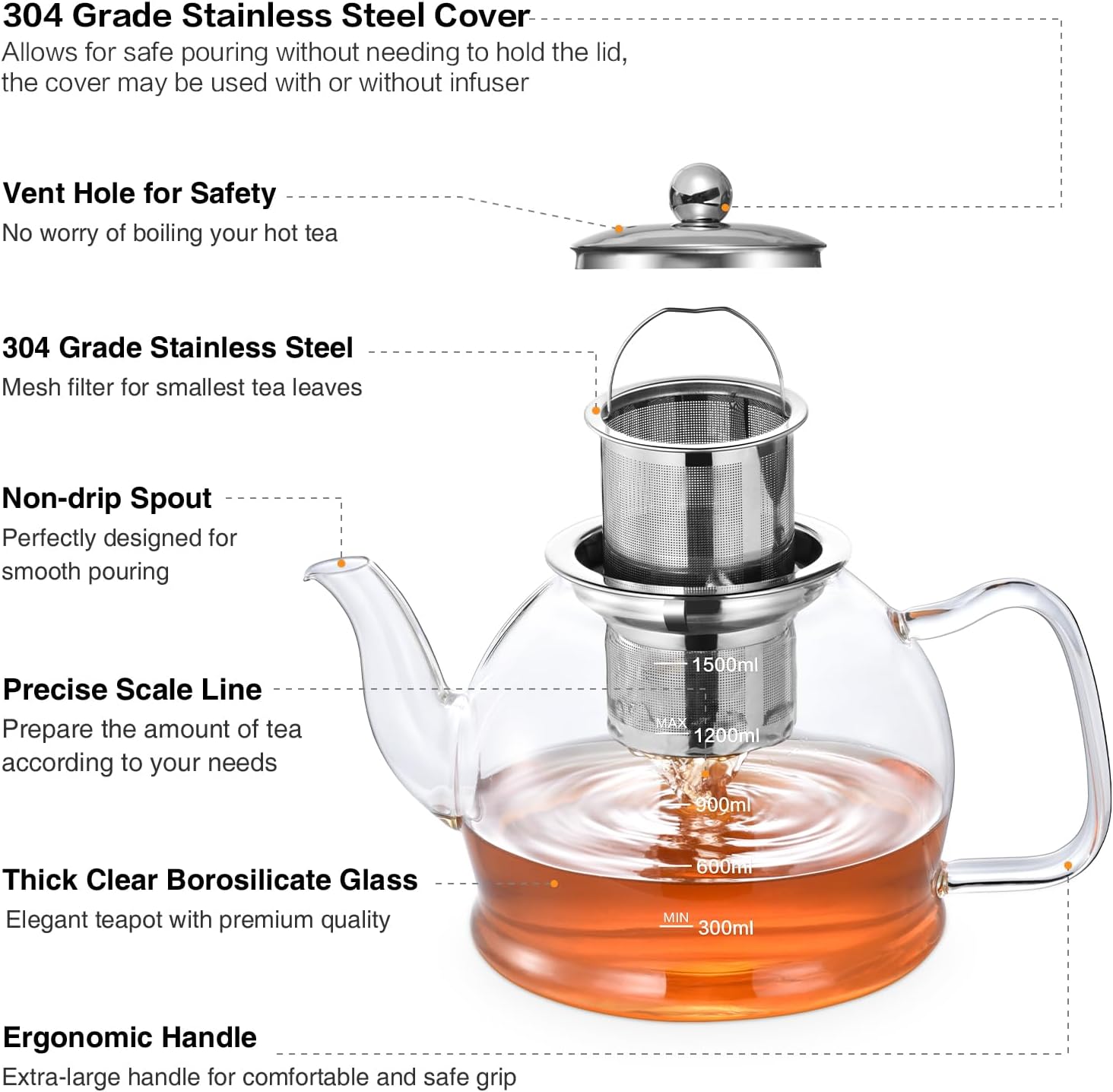 STNTUS Glass Teapot, 52 oz / 1500 ml for Loose Tea, Teapot with Infusers for Loose Tea, Stainless Steel Strainer, Tea Pot for Stove,