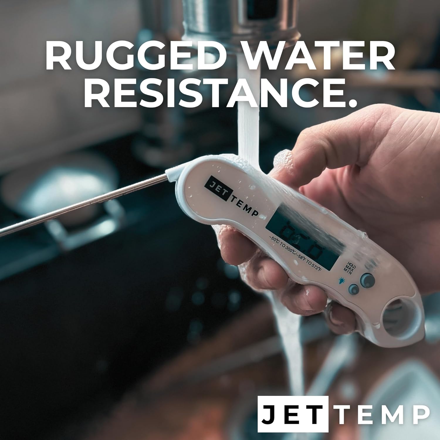 - Foldable Probe: The stainless steel probe folds into the thermometer body for compact storage and easy transport.