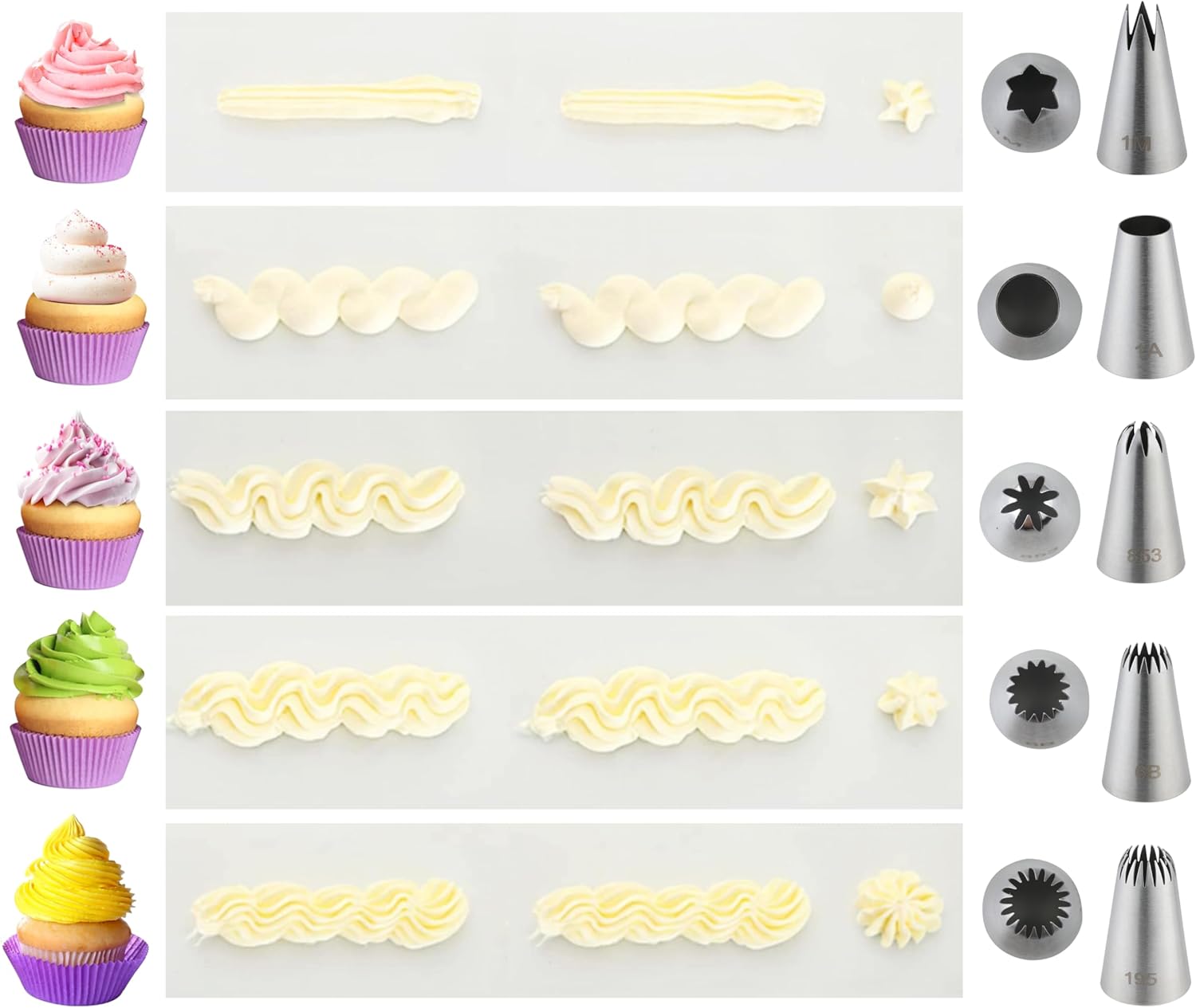 - 1. Versatile Design: Our stainless steel piping tips offers unparalleled versatility for your baking endeavors.Each frosting tips is carefully selected to provide a diverse range of decorating options.The piping tips set includes a round plain tip for classic borders and outlines,an open star tip for beautiful swirls and rosettes,a closed star tip for intricate designs and textures,a drop flower tip for delicate floral embellishments,and a french star tip for unique patterns and accents.With these large piping tips, you'll mees all your needs.